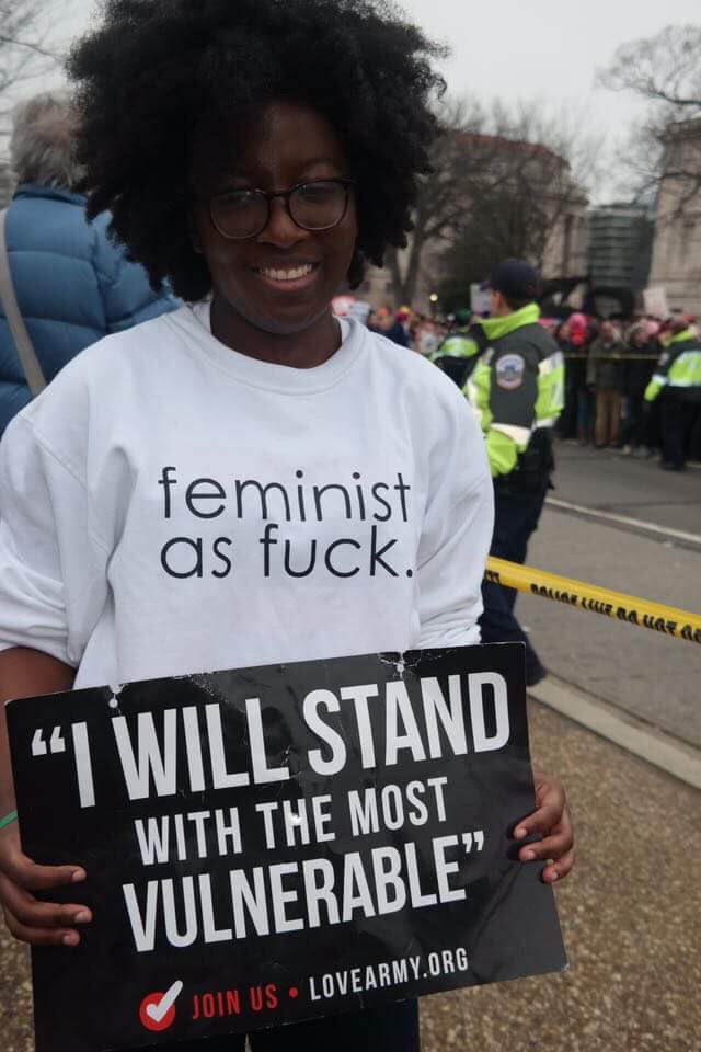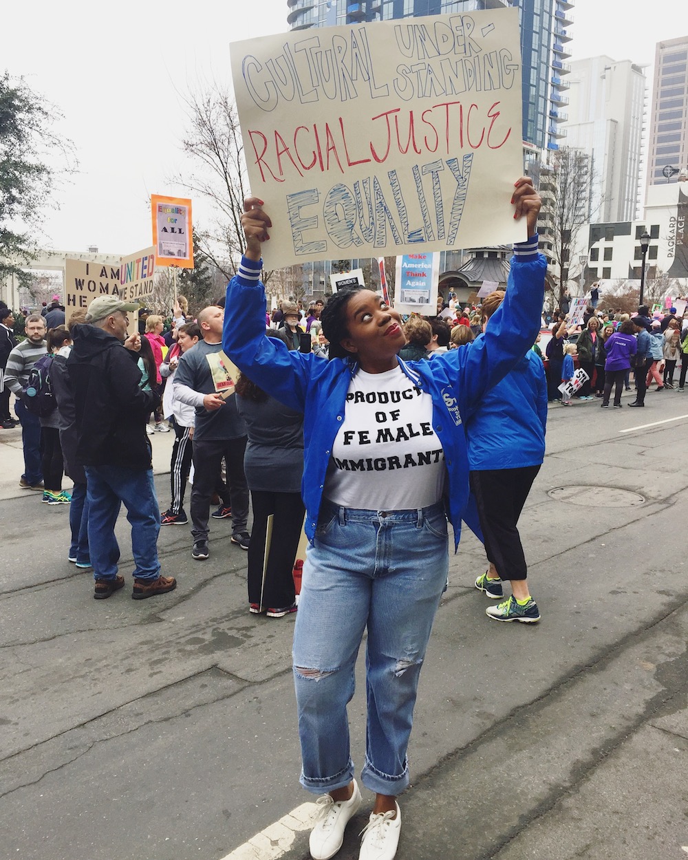 Perrine @The_Perrine_ typed, “I’m Perrine and yesterday #imarchedfor my ancestors who came before me. I’m a first-generation Liberian-American and my family immigrated here in 1980 to give my siblings and I the American Dream as our country battled in a Civil War. Yesterday during the Women’s March on Charlotte, I marched for the female immigrants who raised me in this country, for their voices and mine to be heard, as well as cultural understanding, racial justice and overall equality. I made this shirt and sign I’m photographed in and bought my entire outfit from a thrift store.”