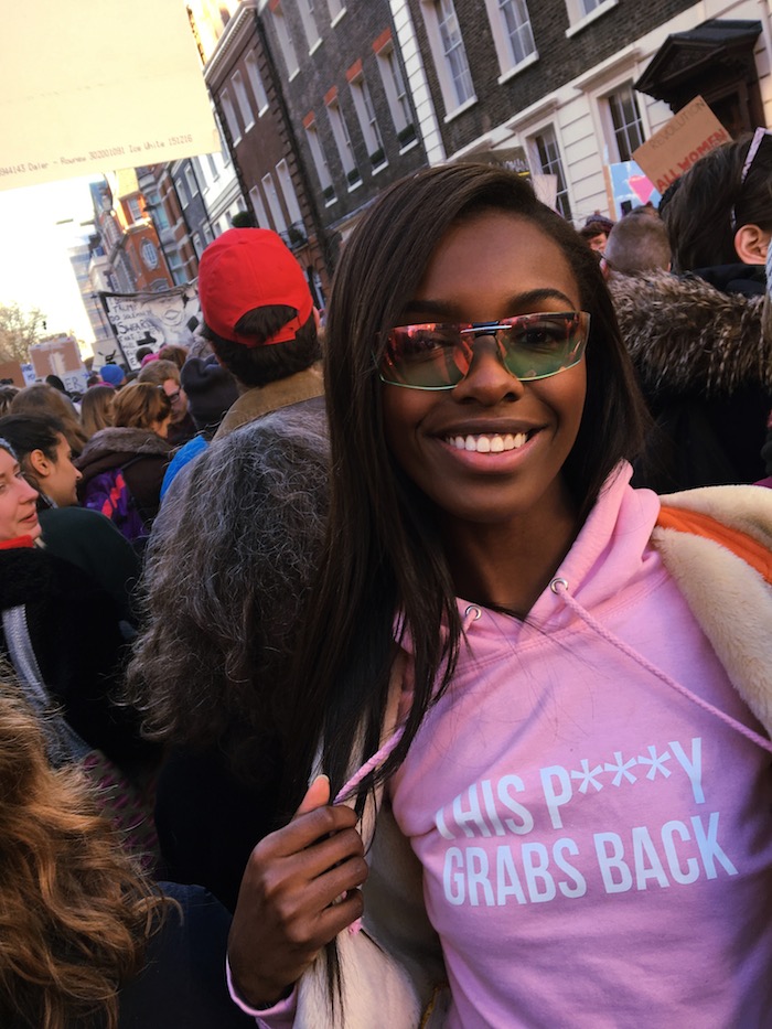 Model Leomie Anderson was on the scene in London, wearing a Lapp the Brand ‘This P***Y Grabs Back” pink sweatshirt, also worn by Rihanna.