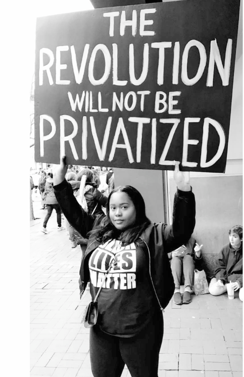 Meechie protested in a Black Lives Matter shirt and a sign that said, “The Revolution will Not be Privatized.”