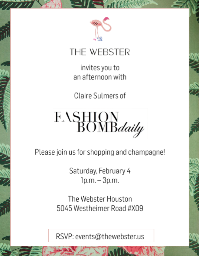 My lonestar tour ends on Saturday February 4th at the Webster! Join us for shopping at Cocktails from 1-3pm. RSVP to events@thewebster.us.