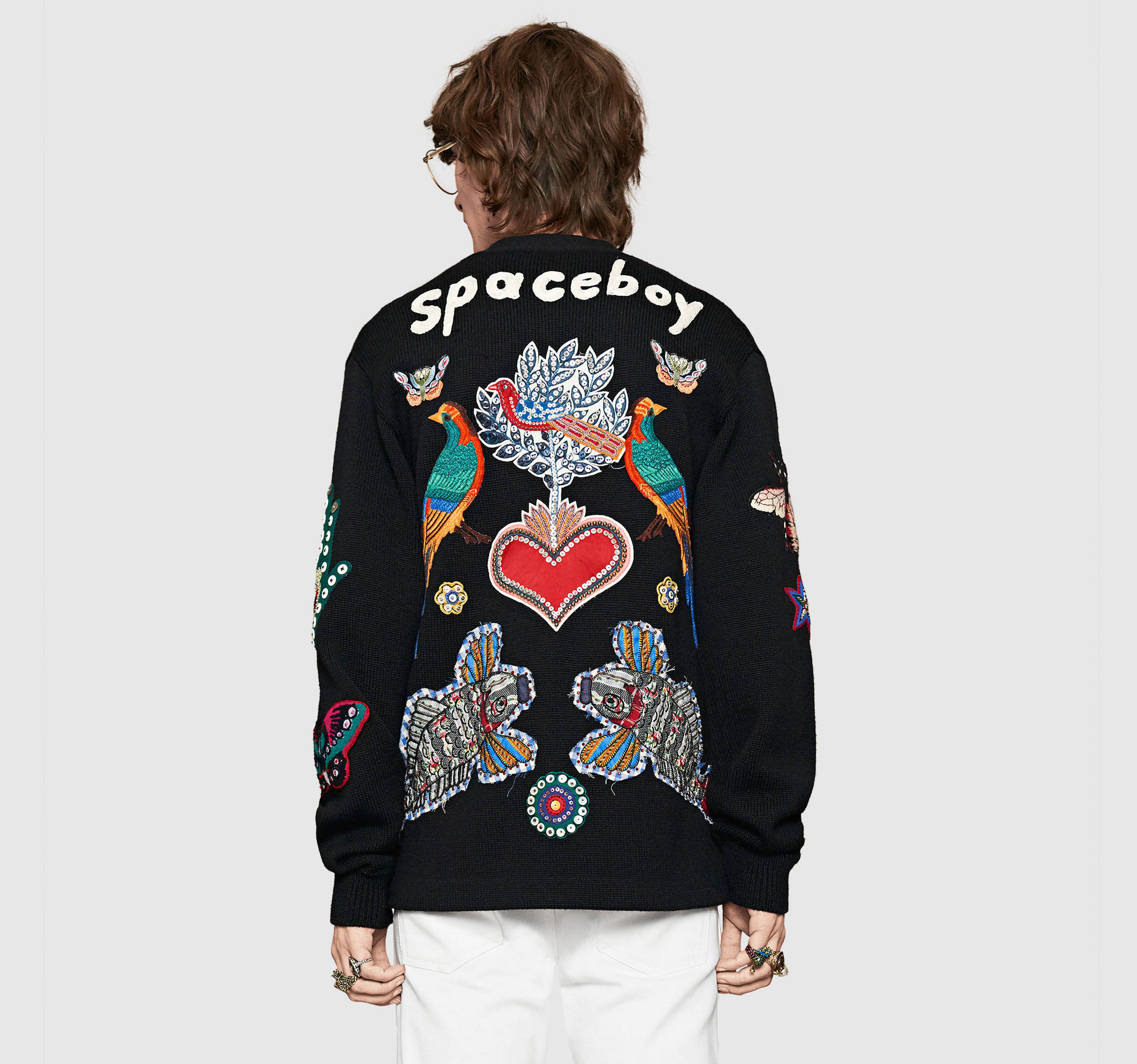 The wool cardigan is richly embellished with 19 different appliqués, all representing one of the collection’s recurring motifs: birds, fish, flowers, hearts, butterflies. The phrase “Space Boy” is applied across the back.