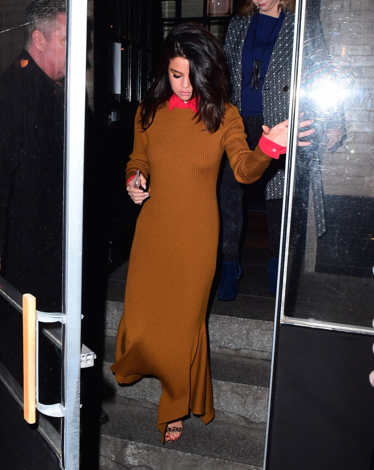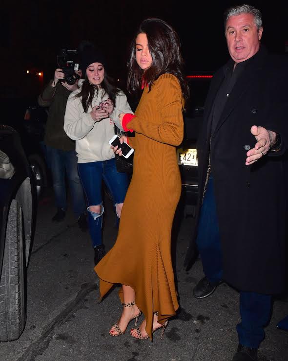 Victoria Beckham stepped out in New York City clad in a mustard colored dress from her Pre Fall 2017 collection. Selena Gomez was also spotted in New York City in the same ensemble: