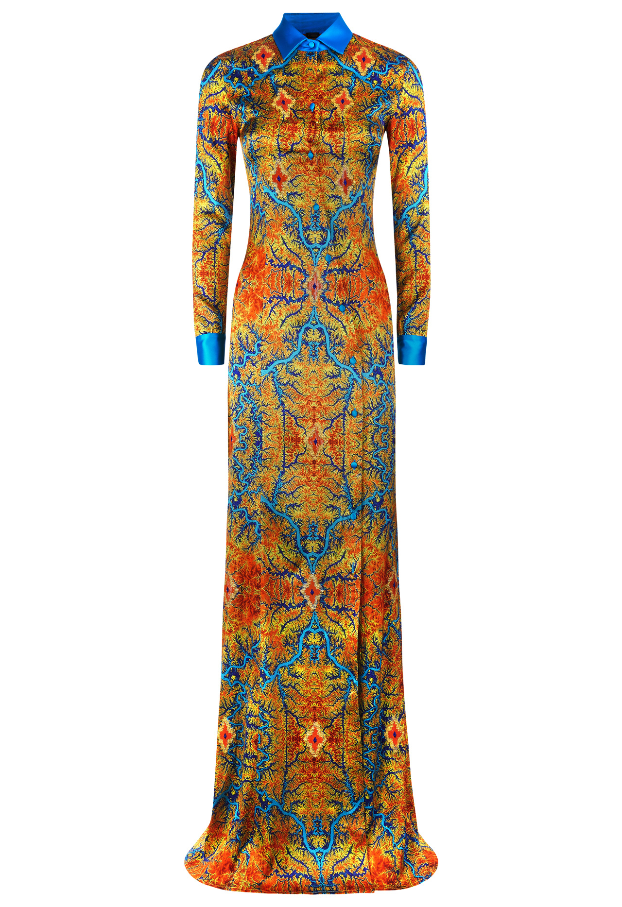 The Fjords long silk dress features an intricate topographical map printed in vibrant tones of orange, yellow and bright blue highlights. Collared and cuffed with a buttoned cross-over front, it is perfectly tailored in fluid bi-stretch, double-faced silk that prevents wrinkling, even after hours of wear.