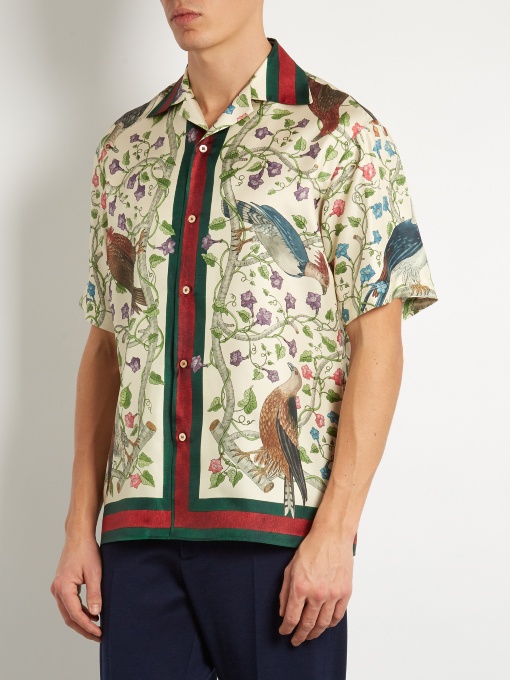 The bowling shirt, with a loose, boxy fit and short sleeves has been often incorporated into Alessandro Michele’s collections. Made in silk twill, this style features an allover print with various birds of prey set against a floral and vine motif.