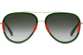 The gold metal sunglasses features a green/red/green Web frame, gold metal temples with black tips and green shaded lens.