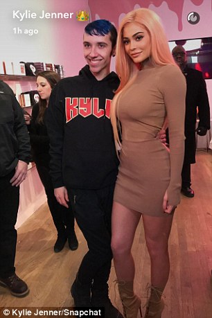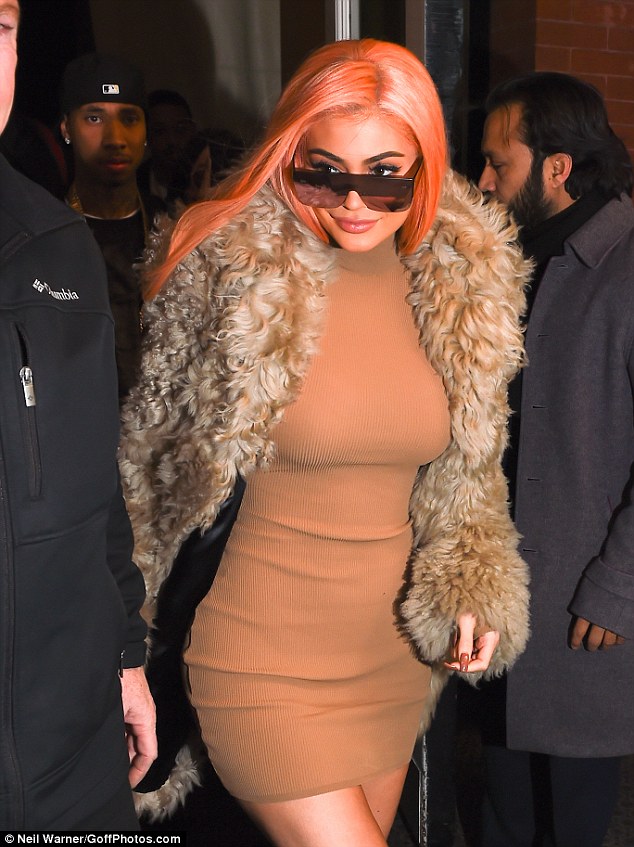 Kylie Jenner arrived at her Pop Up Shop in Soho clad in a fur coat, pink wig and $1,076 Yeezy Season 3 High Neck Mini Dress: