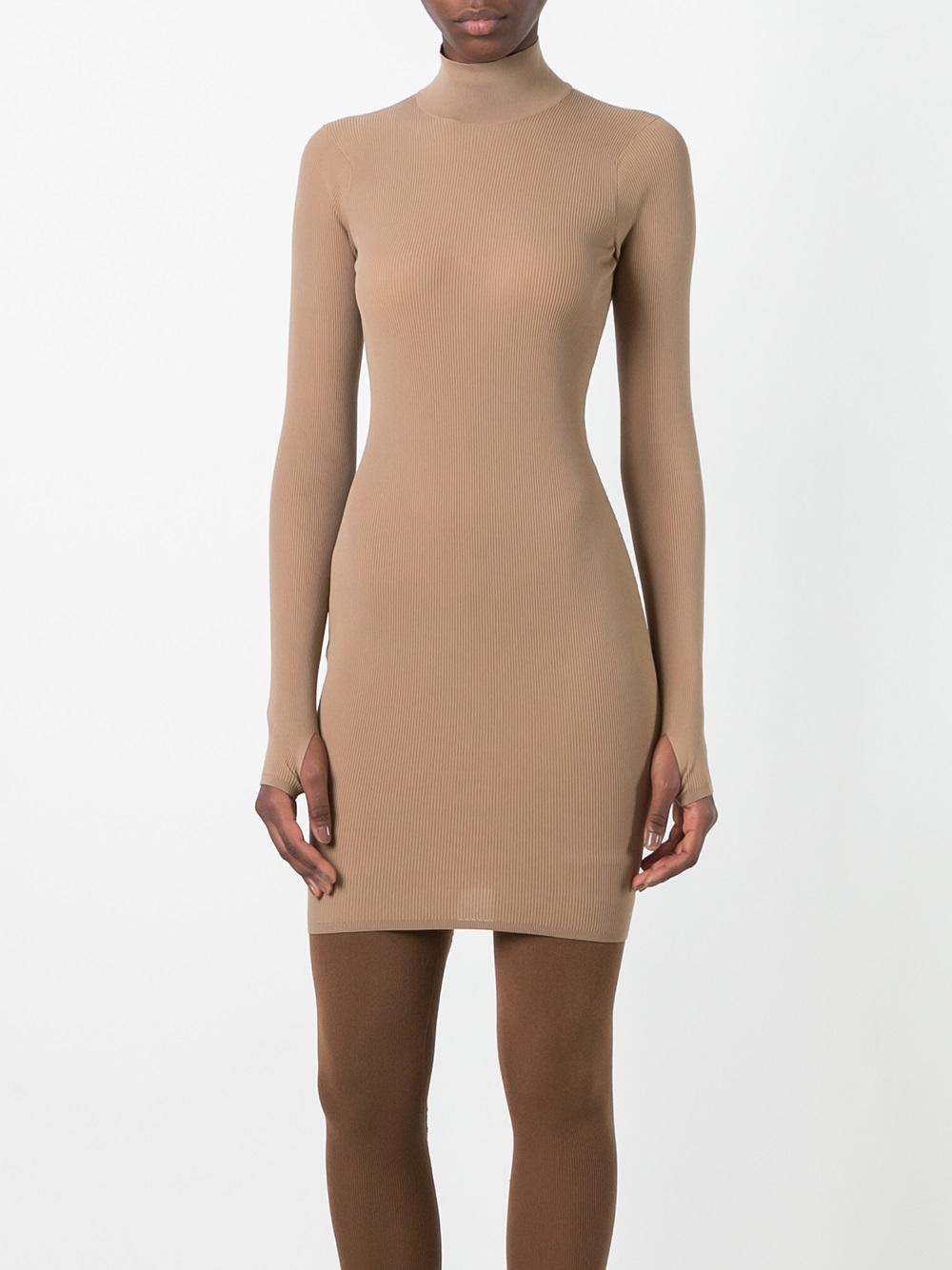 The nude colored mini dress features a high neck and long sleeves.