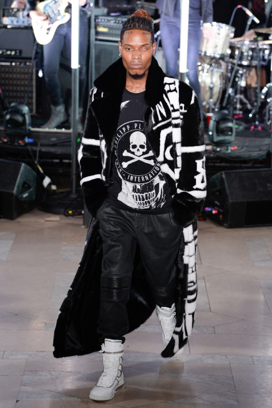 The show itself gave nods to New York swag and hip hop culture in particular. Models flaunted braided hairstyles, locs, and slickback while rocking shiny oversized puffer jackets, fur coats, velvet onesies, bedazzled leggings, and thigh high boots, all decorated with Plein’s logo (see all the runway pictures in the gallery above).