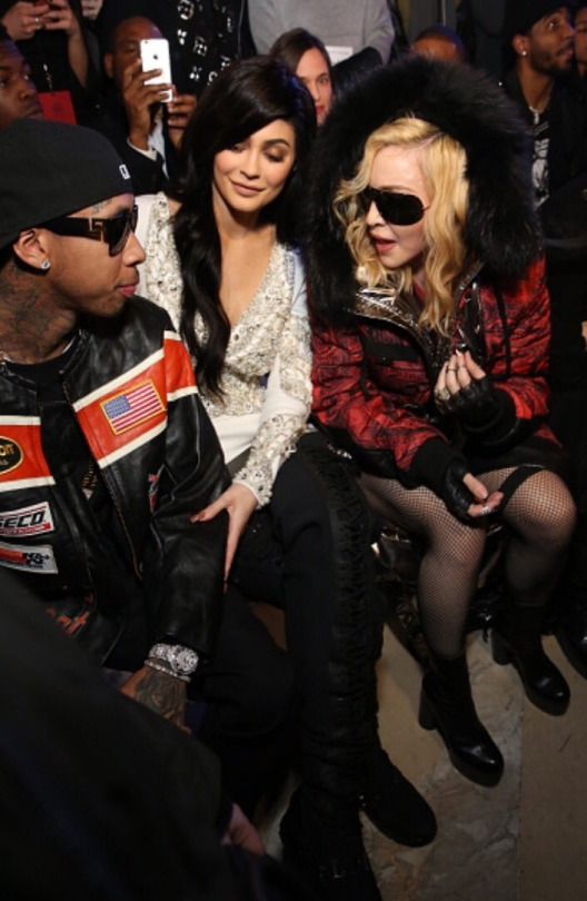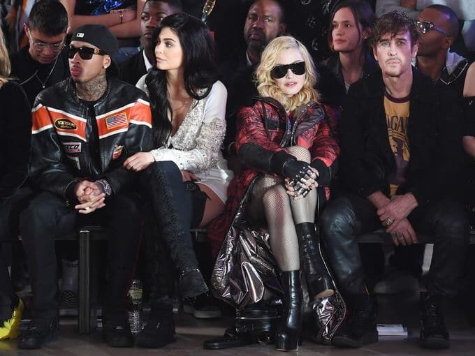 This was Plein’s first showing Stateside, and he went BIG. Outside, Fort Knox like security guarded the majestic venue, which was festooned with projections of American Flags. Inside, the front row was jam packed with American hip hop and pop stars, along with socialites and editors. Fat Joe, Remy Ma, and Keyshia Cole were perched on one side, while Slick Rick held court in the main hall. Paris Hilton and Nicky Hilton were in the building; Kylie Jenner, Tyga, Victor Cruz, Shay Mitchell, and Carine Roitfeld saved just enough space on the front row for Madonna, who slid into her seat an hour after the scheduled start time.