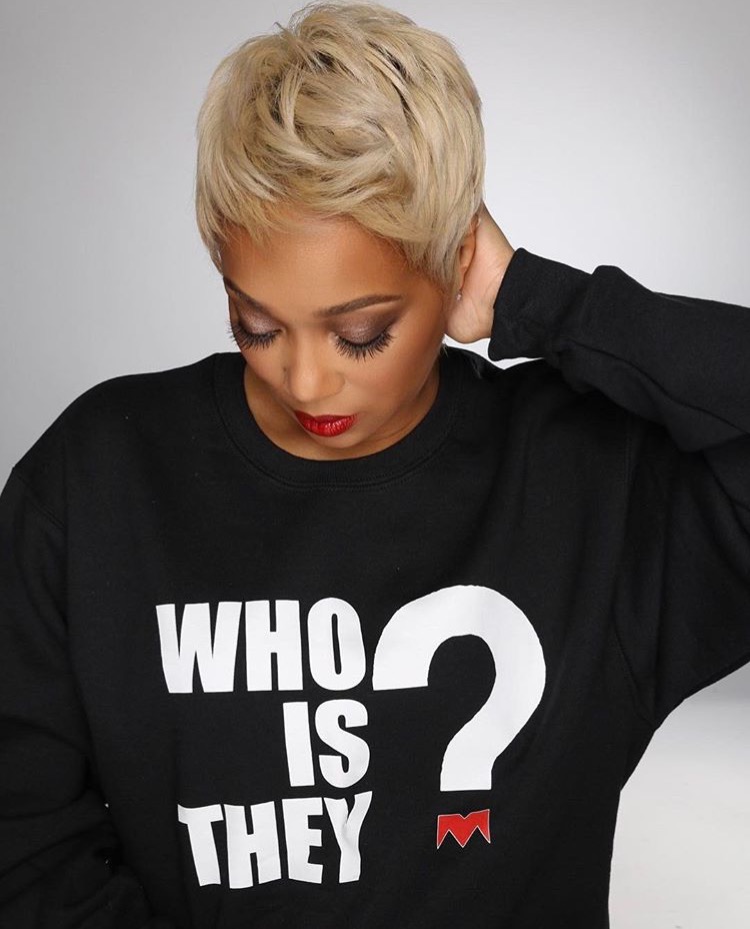 Crooner Monica Brown rocked a new stunning blonde cropped pixie on the ‘Gram while decked out in a $60 Monica Apparel Who Is They? Black Sweatsuit Set: