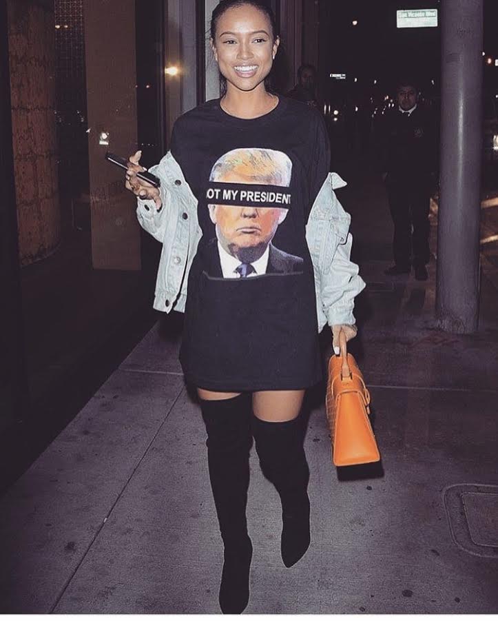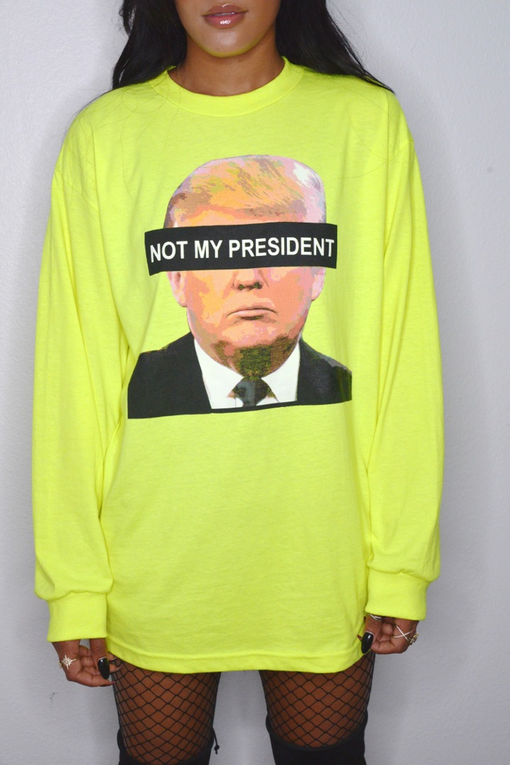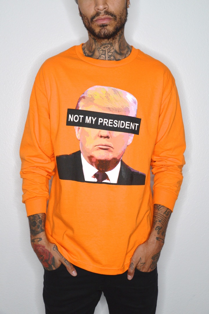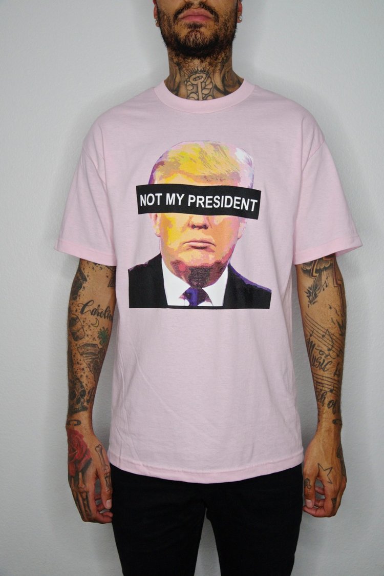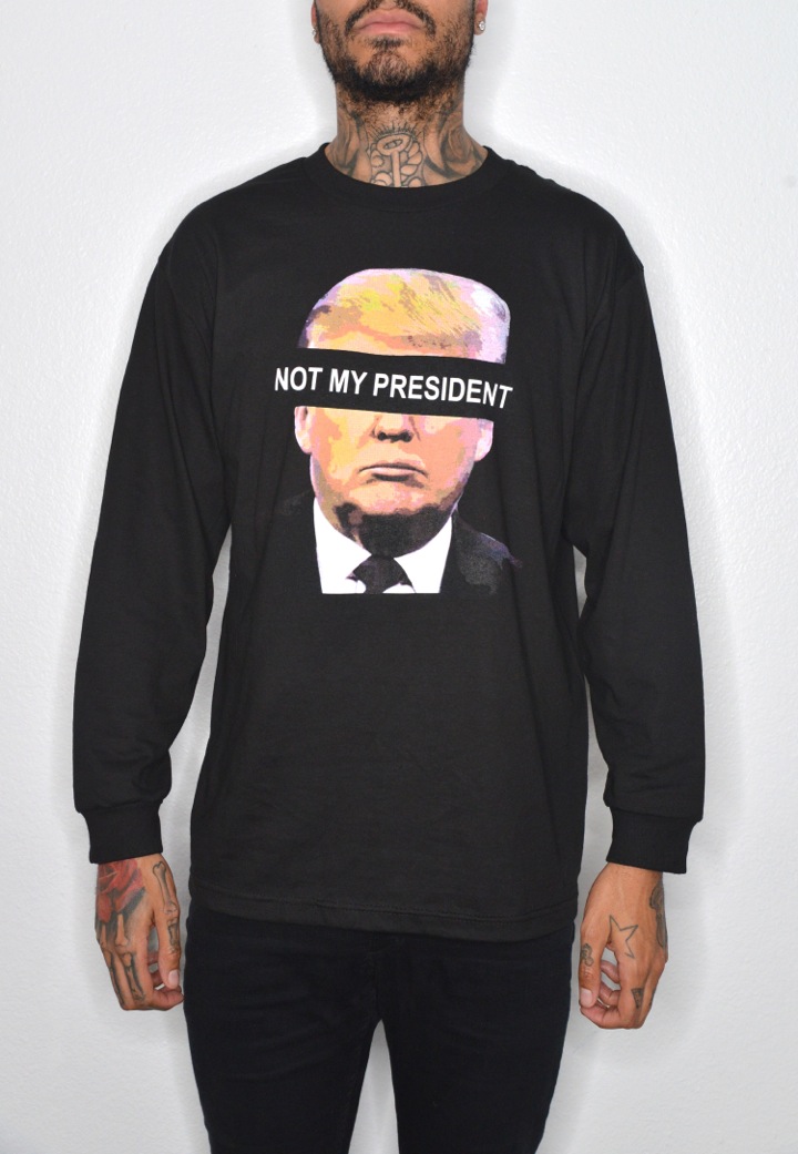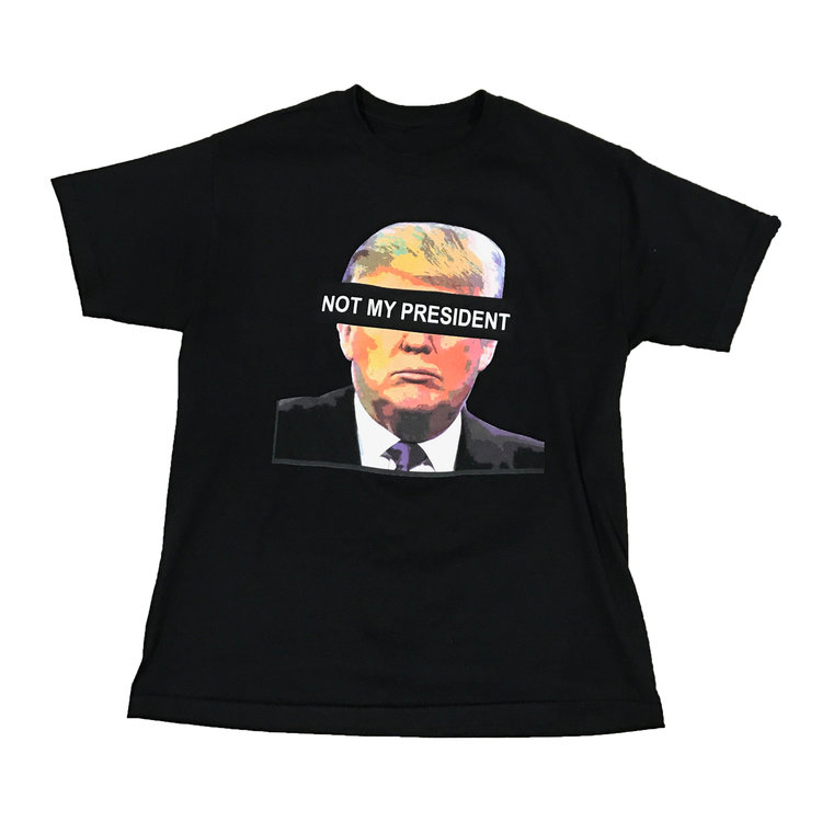 The unisex, black, short sleeve tee features Donald Trump’s face with the words, “NOT MY PRESIDENT,” over his eyes.