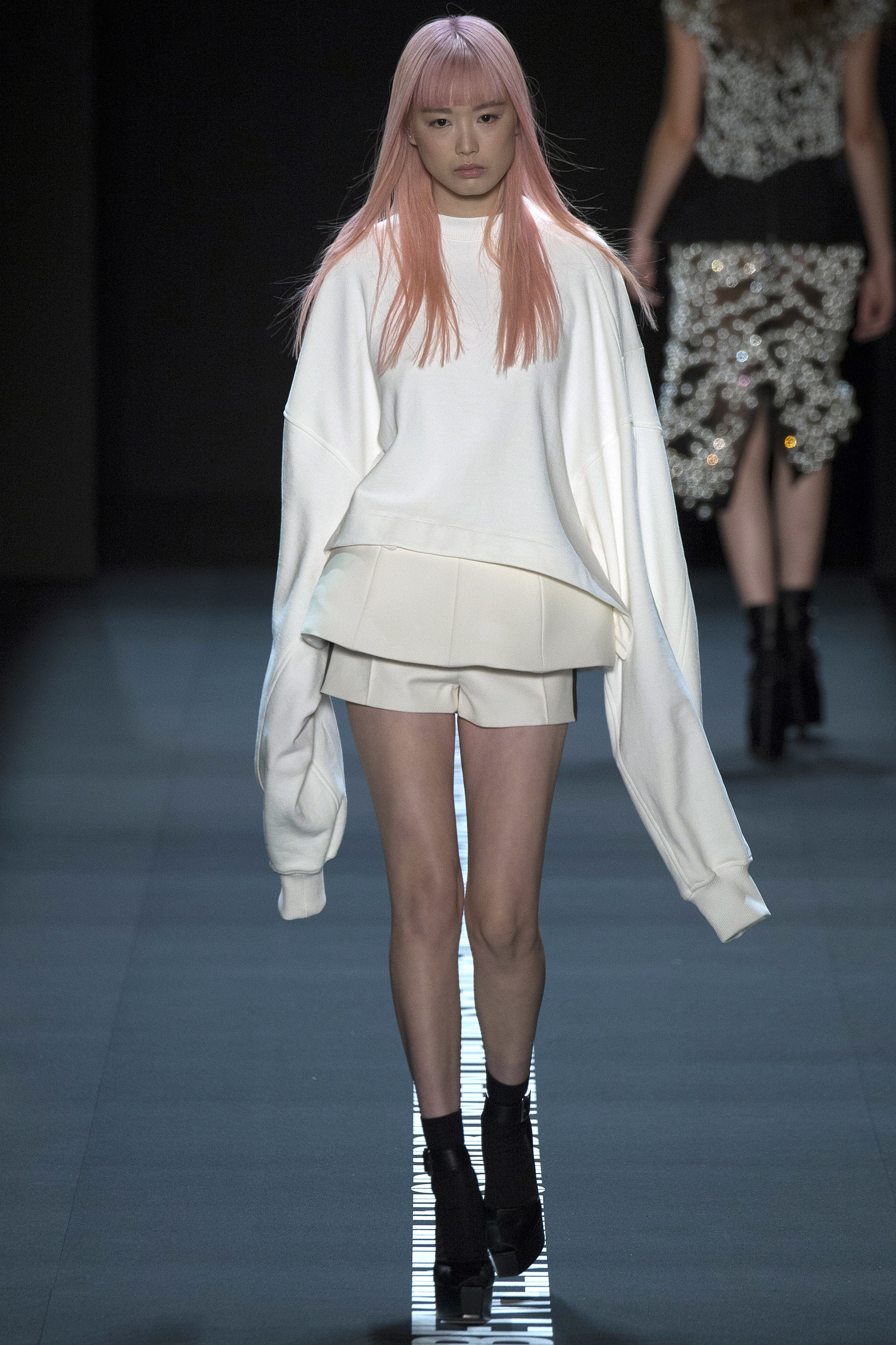 Hailey Baldwin headed to the Yeezy Season 5 show clad in a Vera Wang Spring 2017 White Sweat Shirt and Peplum Side-Stripe Shorts: