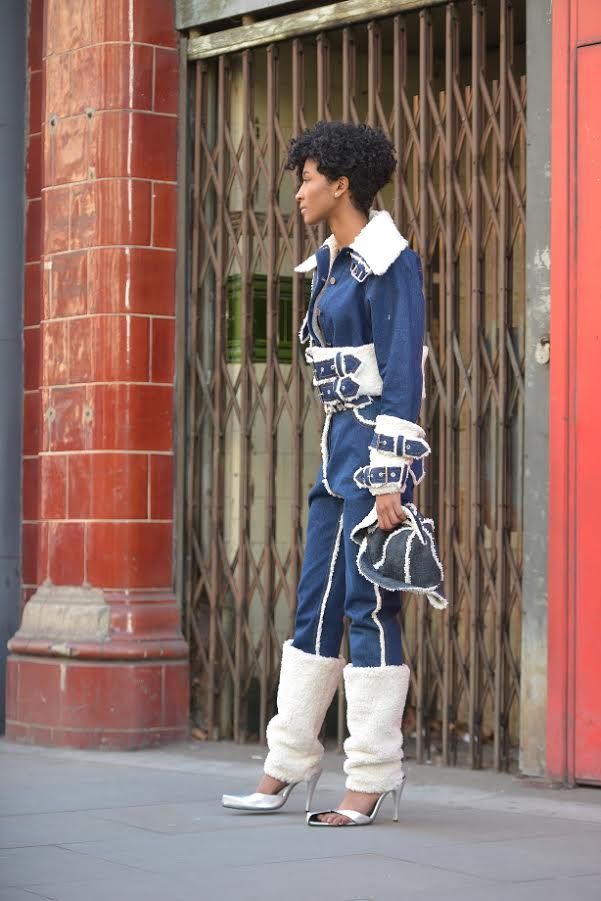 This young lady went bold in a full denim/shearling look.