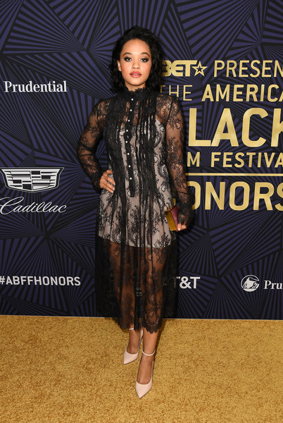 Actress Kiersey Clemons donned a Philosophy Official black laced dress.