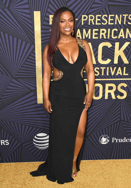 Singer, songwriter, and reality star Kandi (and her girls) came out to play in this black and gold low cut, high slit dress by Madison James.