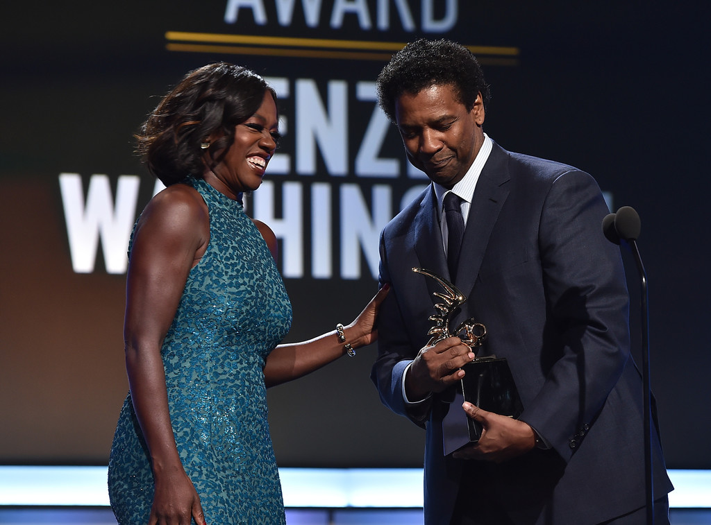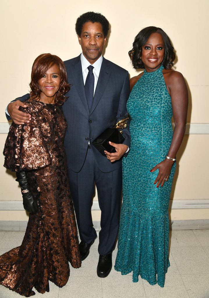 Viola Davis presented an award to Denzel Washington at the American Black Film Festival Honors in a Michael Kors Collection Peacock Floral Embroidered Stretch Tulle Halter Gown: