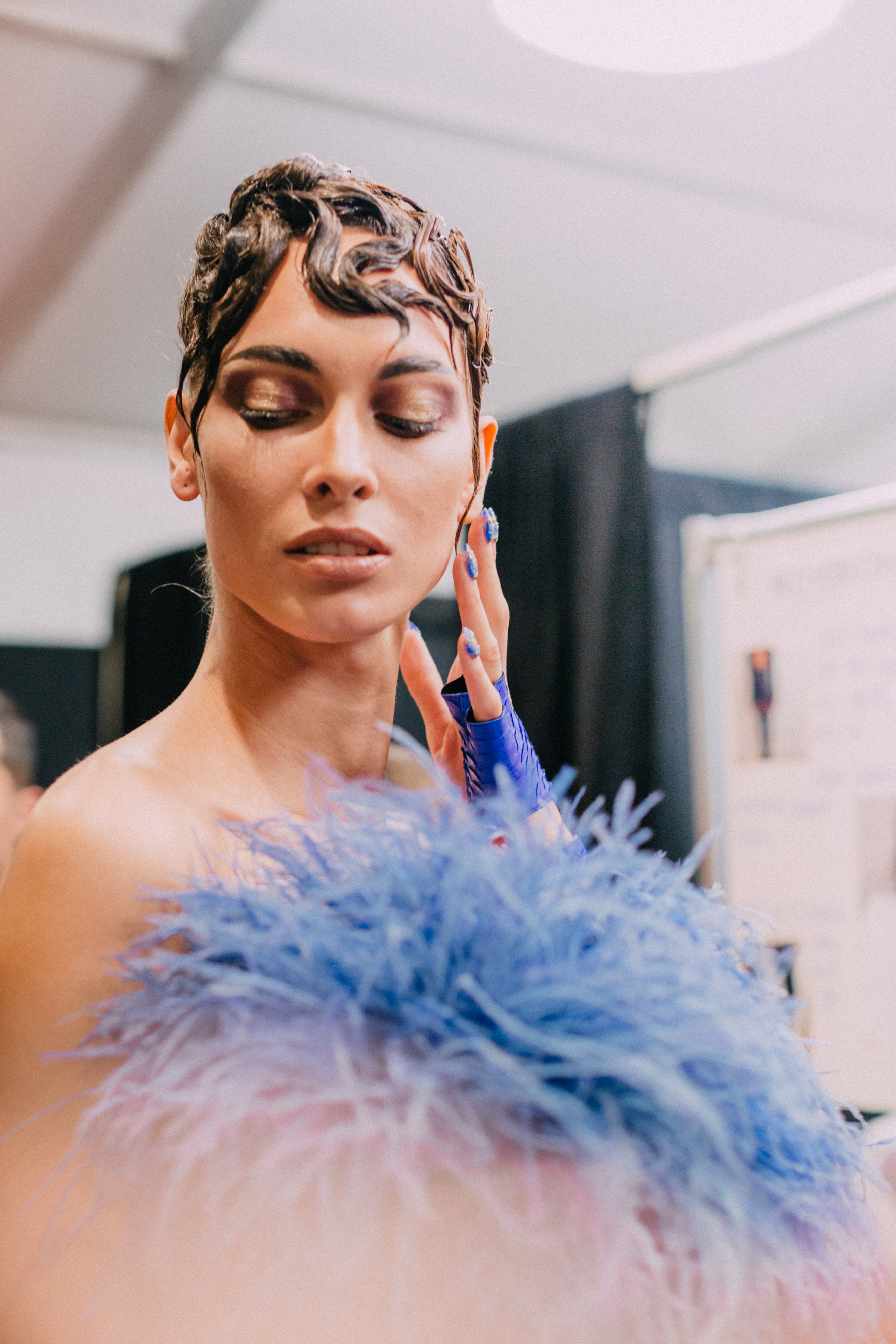 Kien Hoang was responsible for the hair, which was a futuristic side twist, molded towards the front in snake-like shapes—a modern-day Medusa if you will. We’re totally saving this for Halloween: it will probably take us that long to master it anyway. Here, all the tips to get the statement-making look.