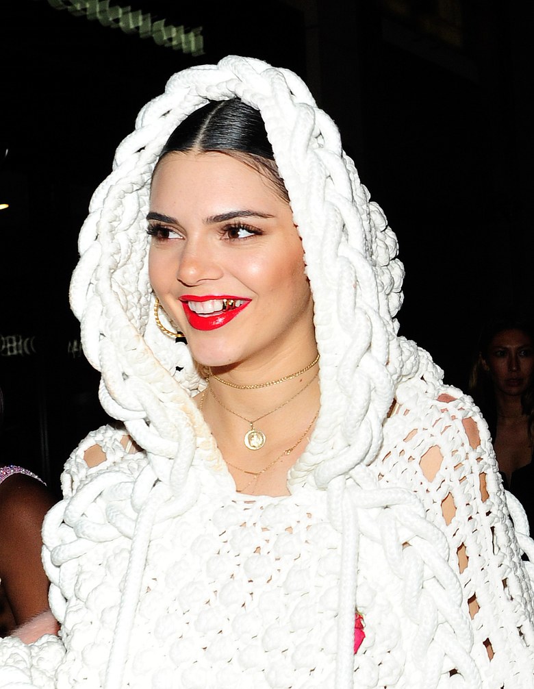 Kendall wore a slip dress under her cape and accessorized with a gold tooth!