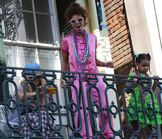 Solange paid a visit to her big sister in New Orleans clad in a pink and red pants set and $210 ‘Kurt’ sunglasses by Sunday Somewhere: