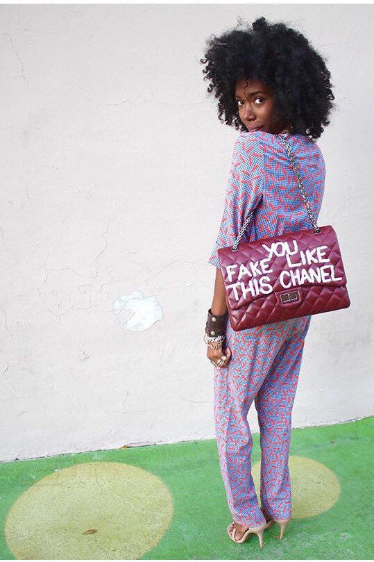 As if styling wasn’t enough to keep this Georgia Peach busy, she continued to develop designs for her brand. Her fake “Birkin” design caught the attention of model, Amber Rose. She says, “Amber Rose was the 1st celebrity to wear my bag. I am forever indebted to her. She’s the reason why Sonique Saturday kicked off as a west coast brand.” This exposure of her brand created wavelengths within her business. Most recently, her fans have accused the Gucci brand of stealing her graffiti styled design without crediting her, something Sonique finds flattering, not offensive.