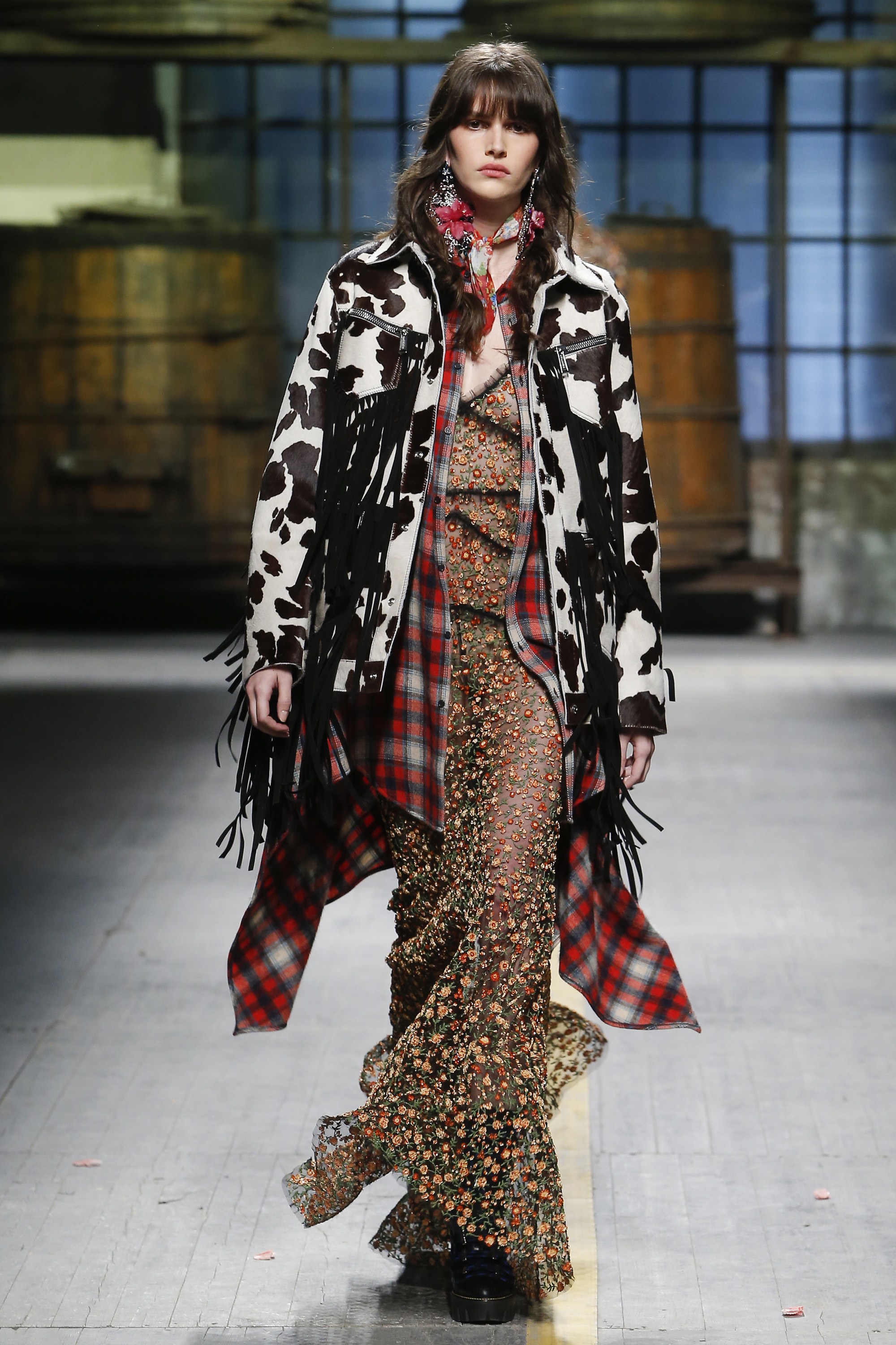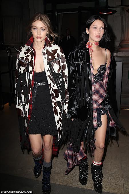 Gigi Hadid headed to dinner in Milan with her sister clad in a DSquared2 Fall 2017 Cow and Plaid Print jacket: