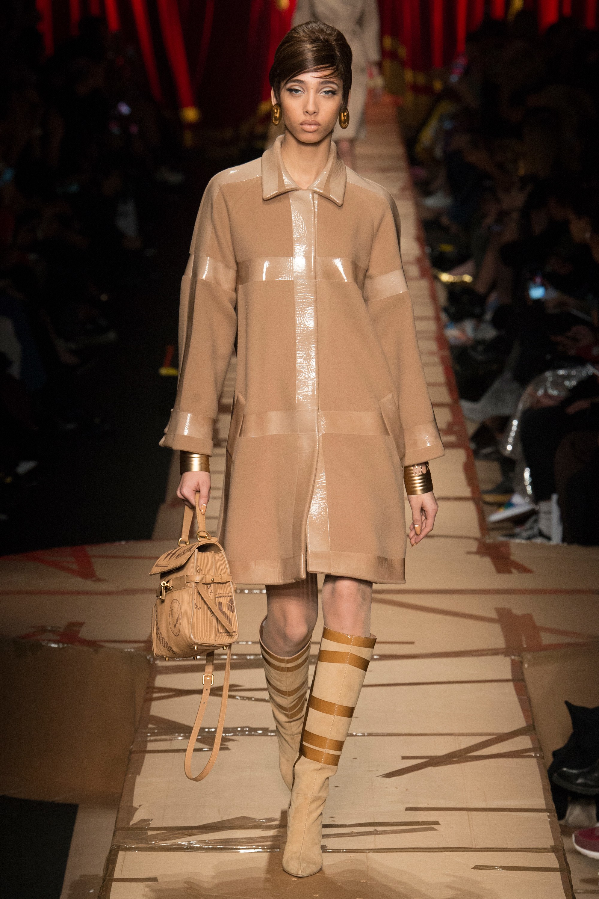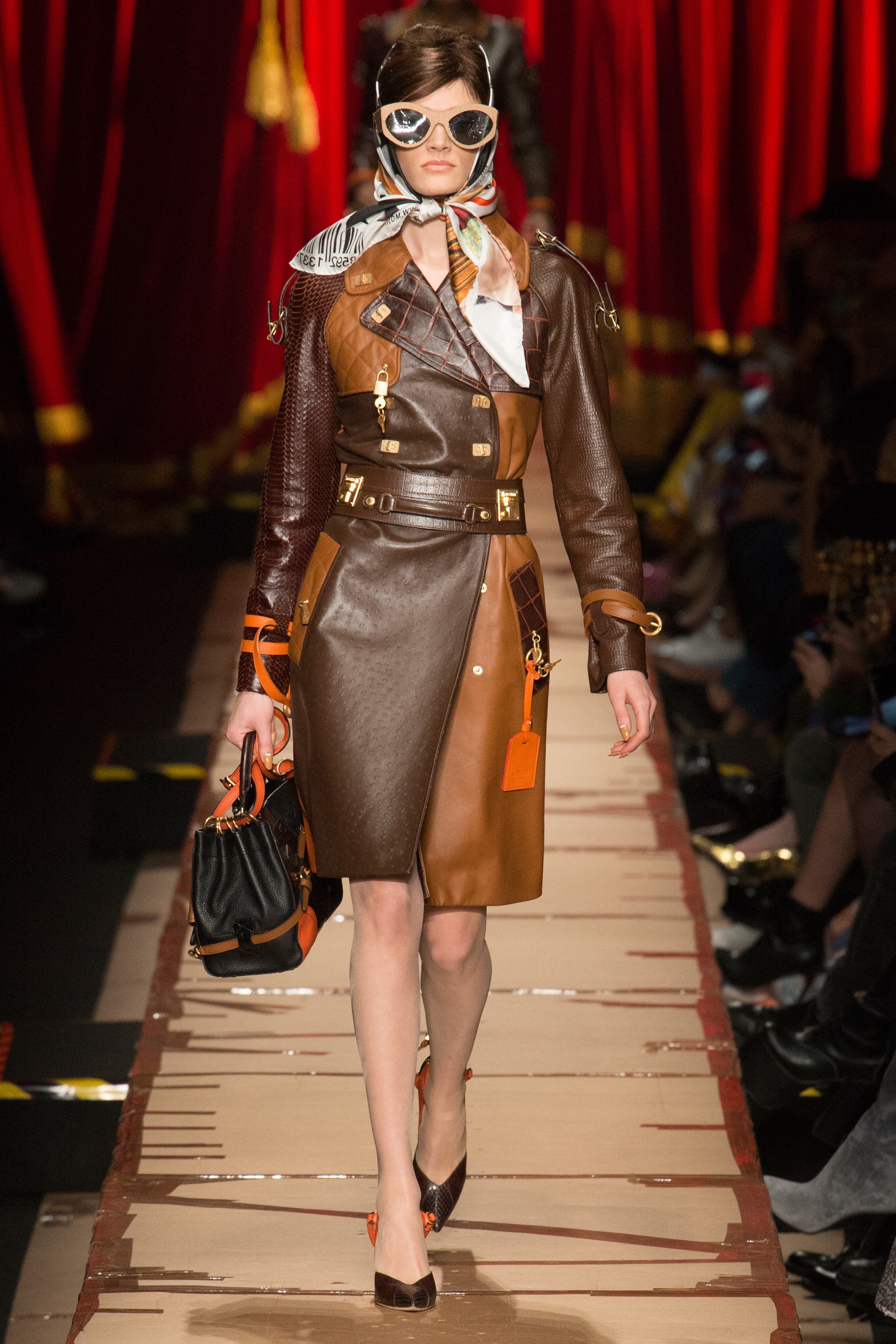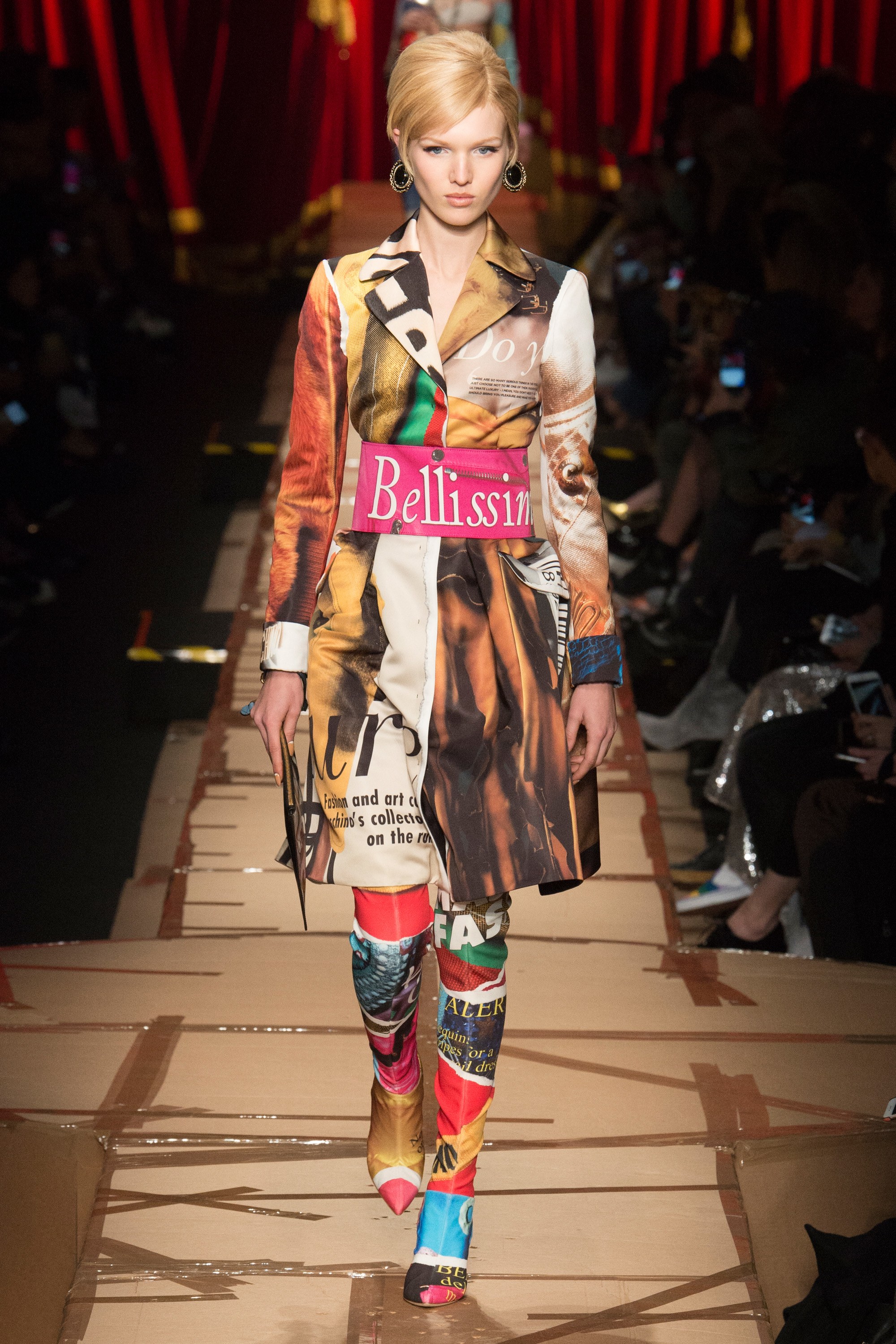 Some looks barely screamed Moschino at all—a rare occurrence in these days of Logomania. A croc, python, and ostrich embossed leather coat was the epitome of luxury, but was not to be upstaged by the absolute practicality of a double-breasted piece with contrast seam trim.