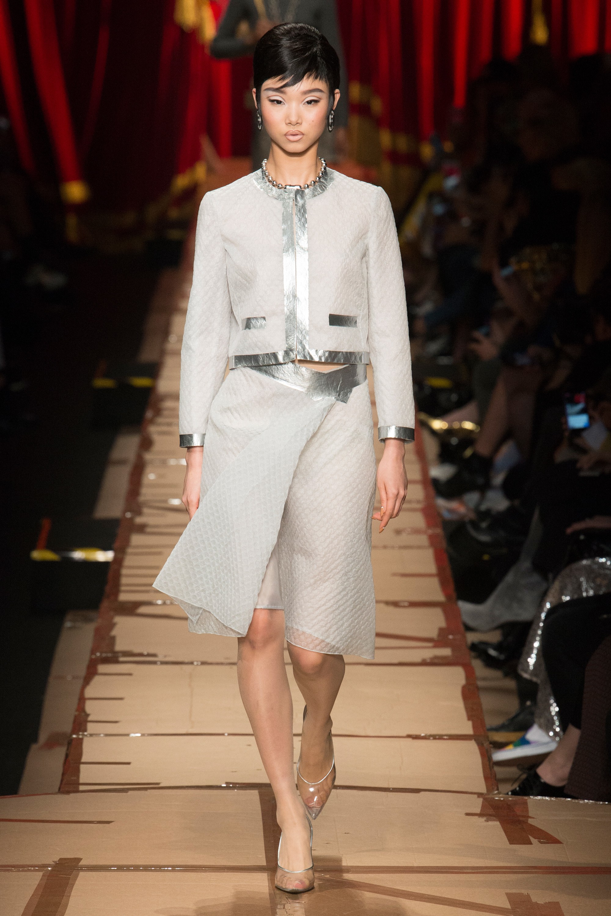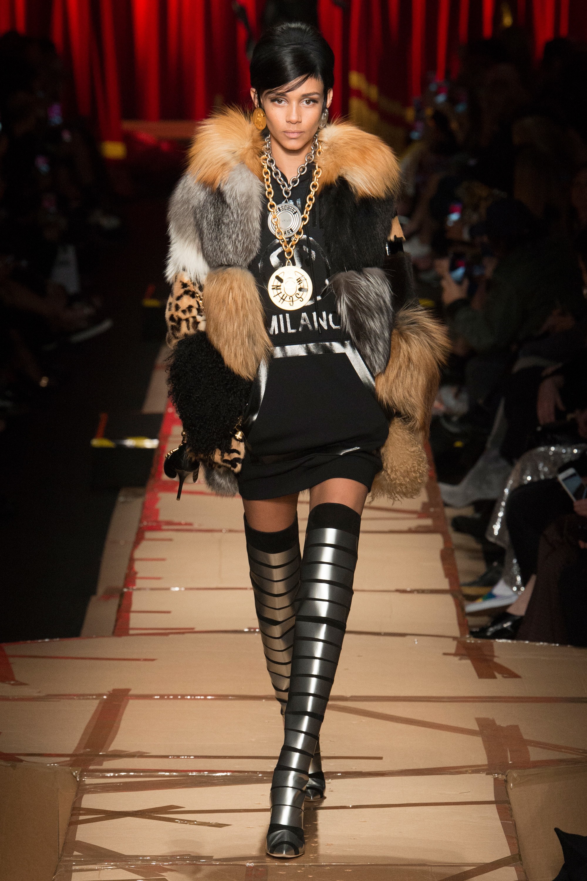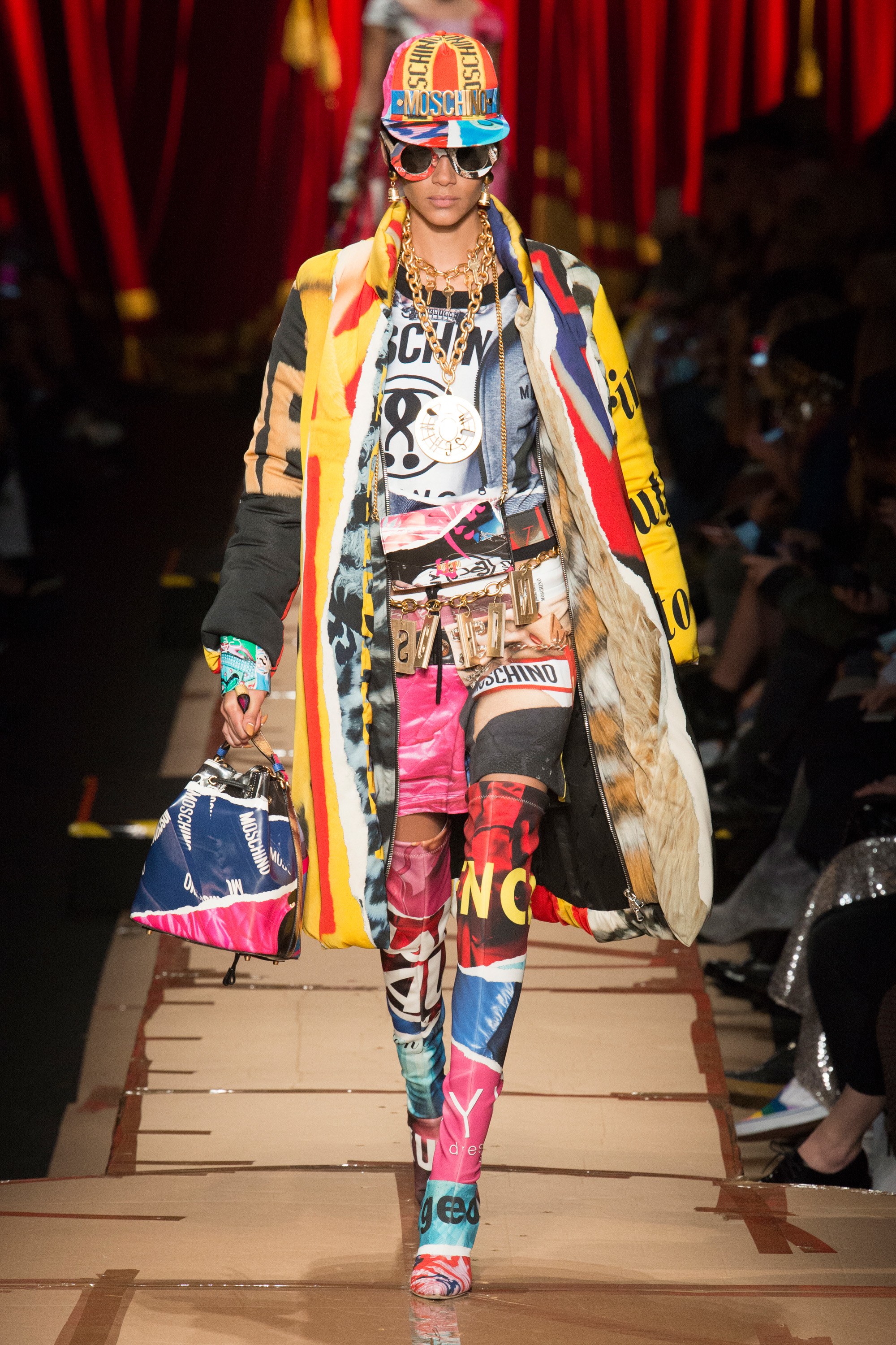 Some looks barely screamed Moschino at all—a rare occurrence in these days of Logomania. A croc, python, and ostrich embossed leather coat was the epitome of luxury, but was not to be upstaged by the absolute practicality of a double-breasted piece with contrast seam trim.