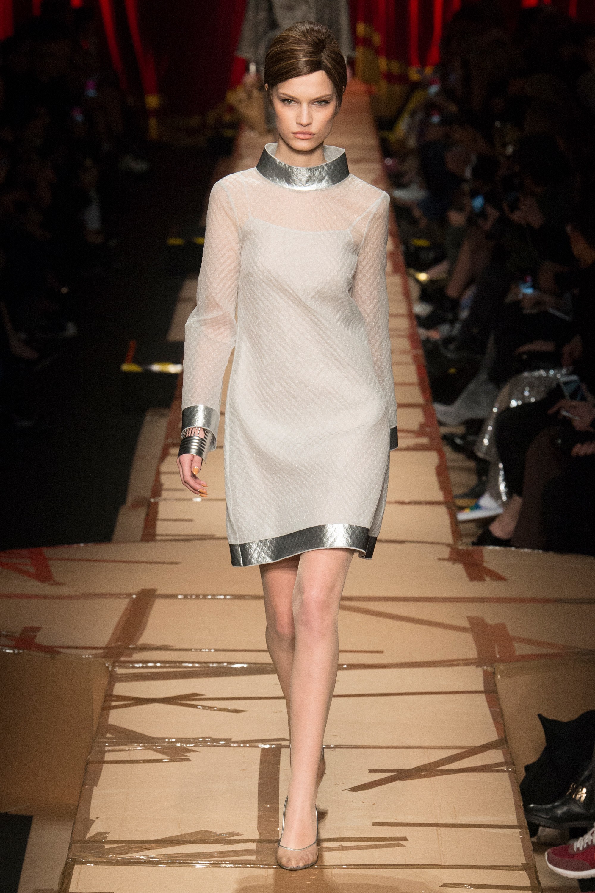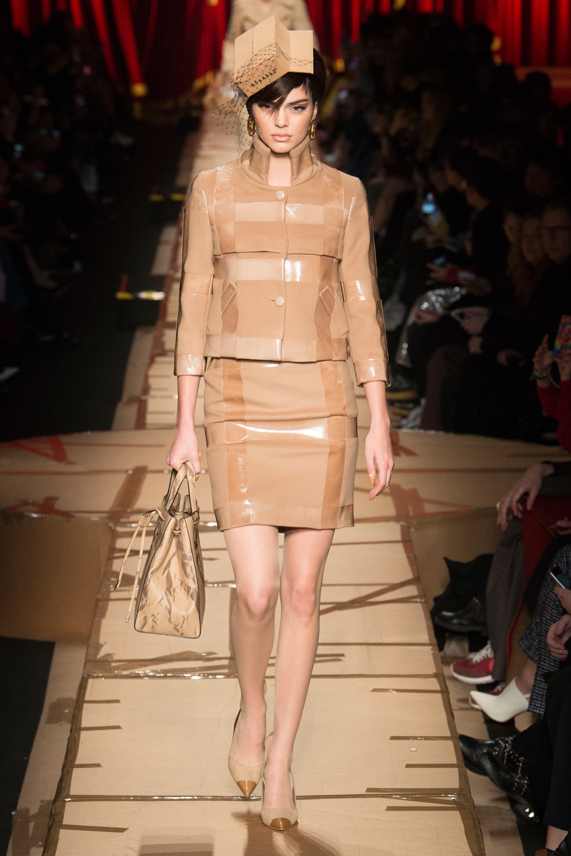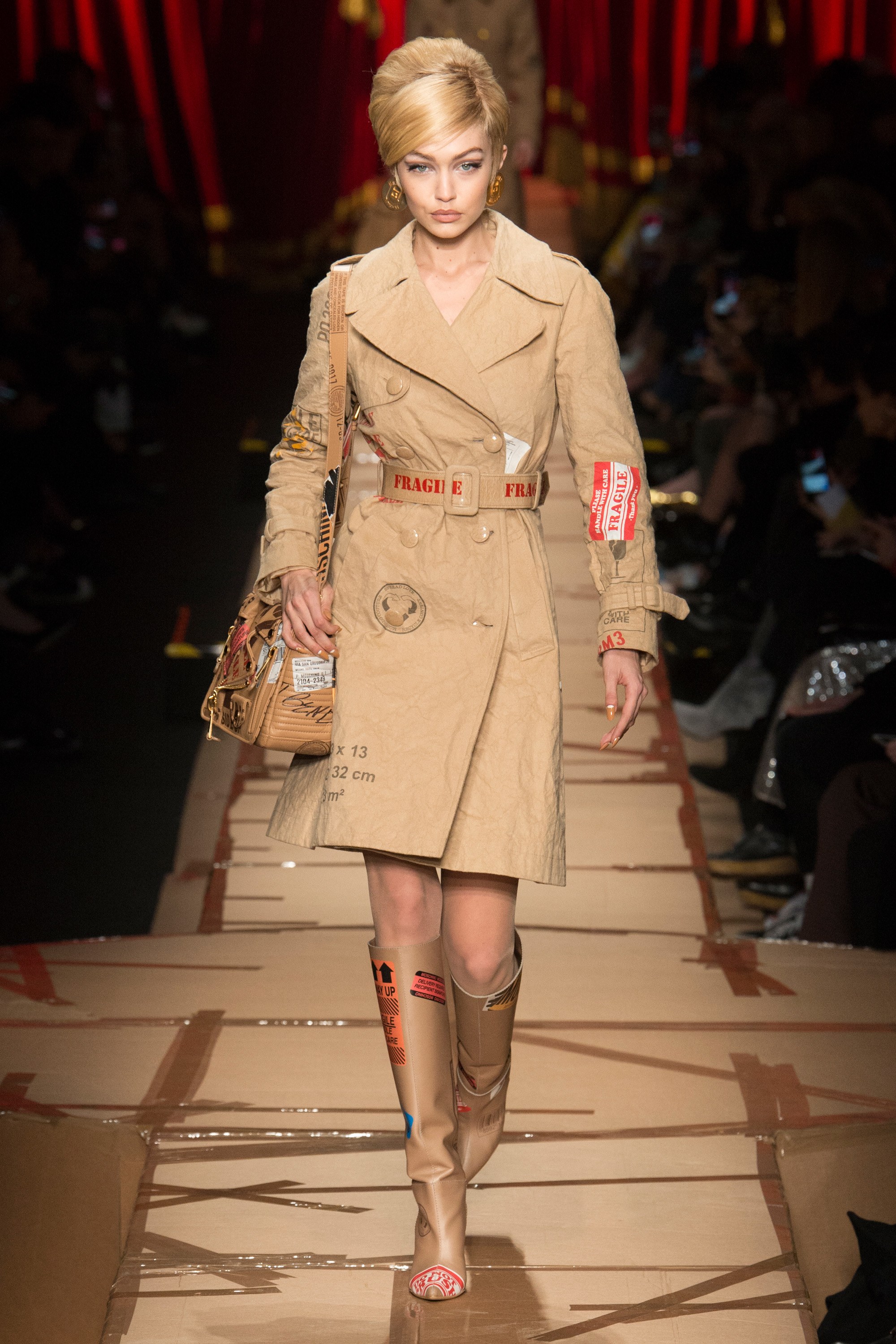 And though inspired by the boxes we all throw away, the opening looks were downright pretty. The opening skirt suit on Kendall Jenner was ladies who lunch but keep it fresh and a “Fragile” trench and knee-high boots on Gigi Hadid was easily one of the most functional ensembles in the assortment.