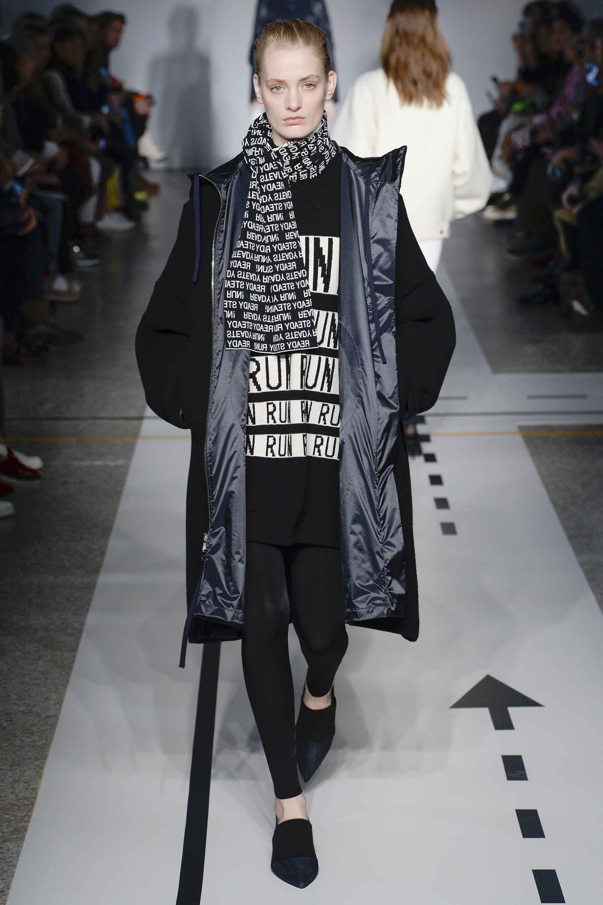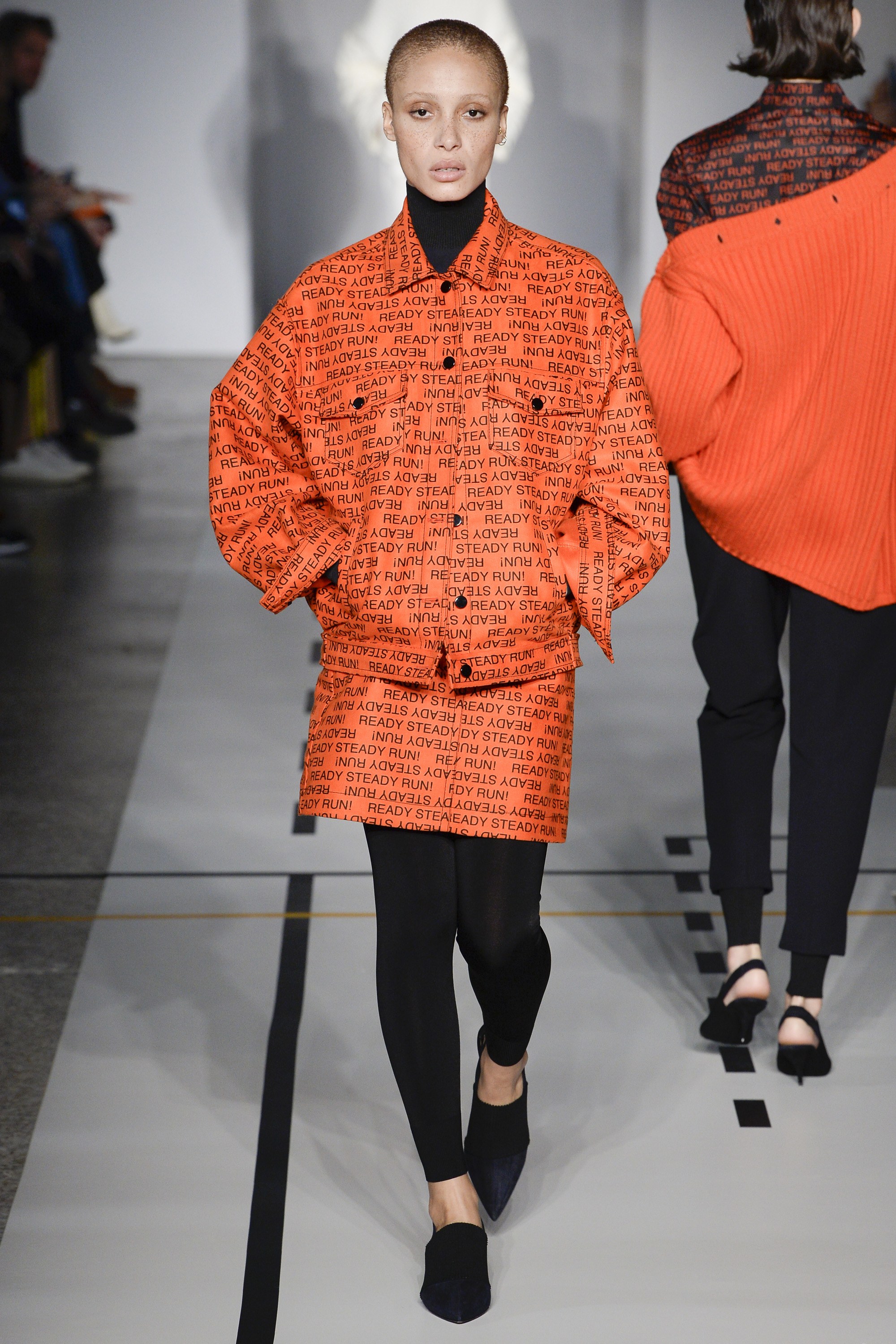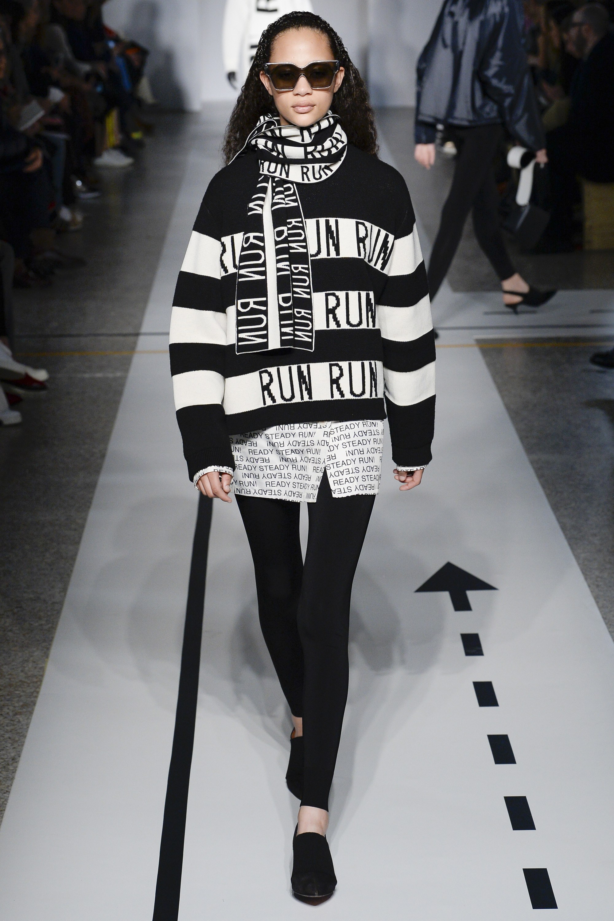 But it’s a logomania world, thus the collection’s graphics did pack a punch. A “Steady Run” skirt suit on Adwoa Aboah had major street style snap appeal, while a quilted “Run” scarf and sweater on Imaan Hammam was perfection…though not made for the actual sport, of course.