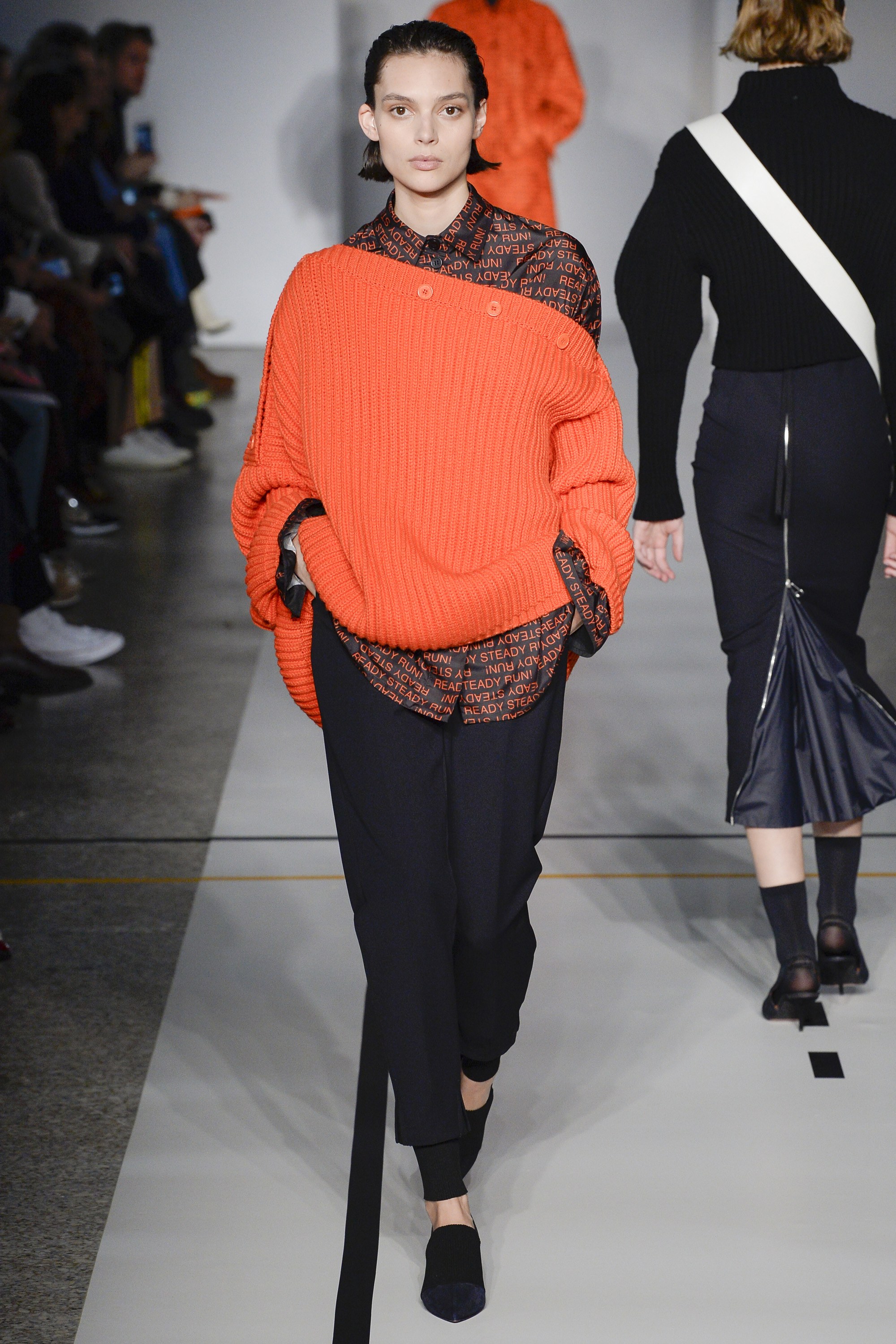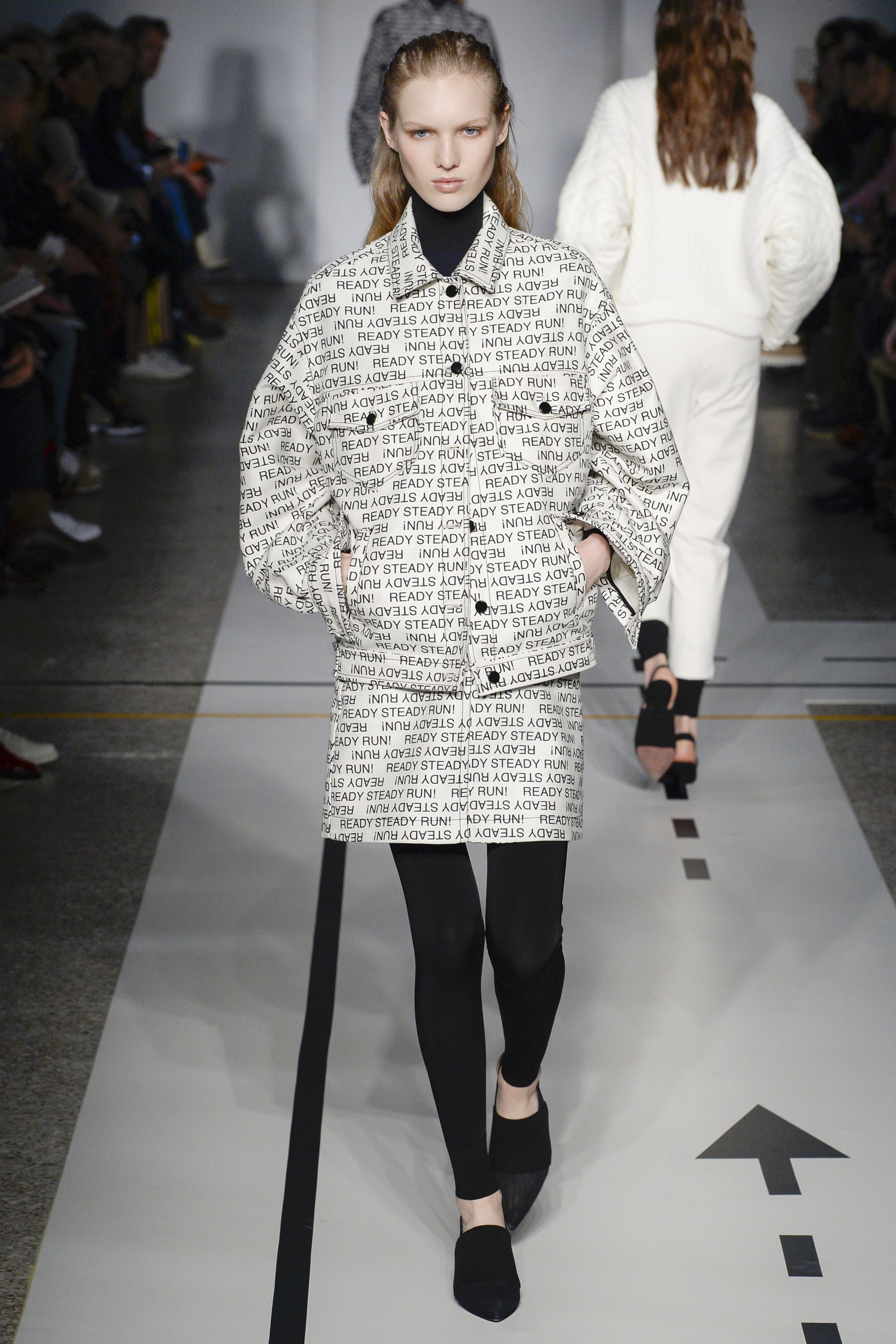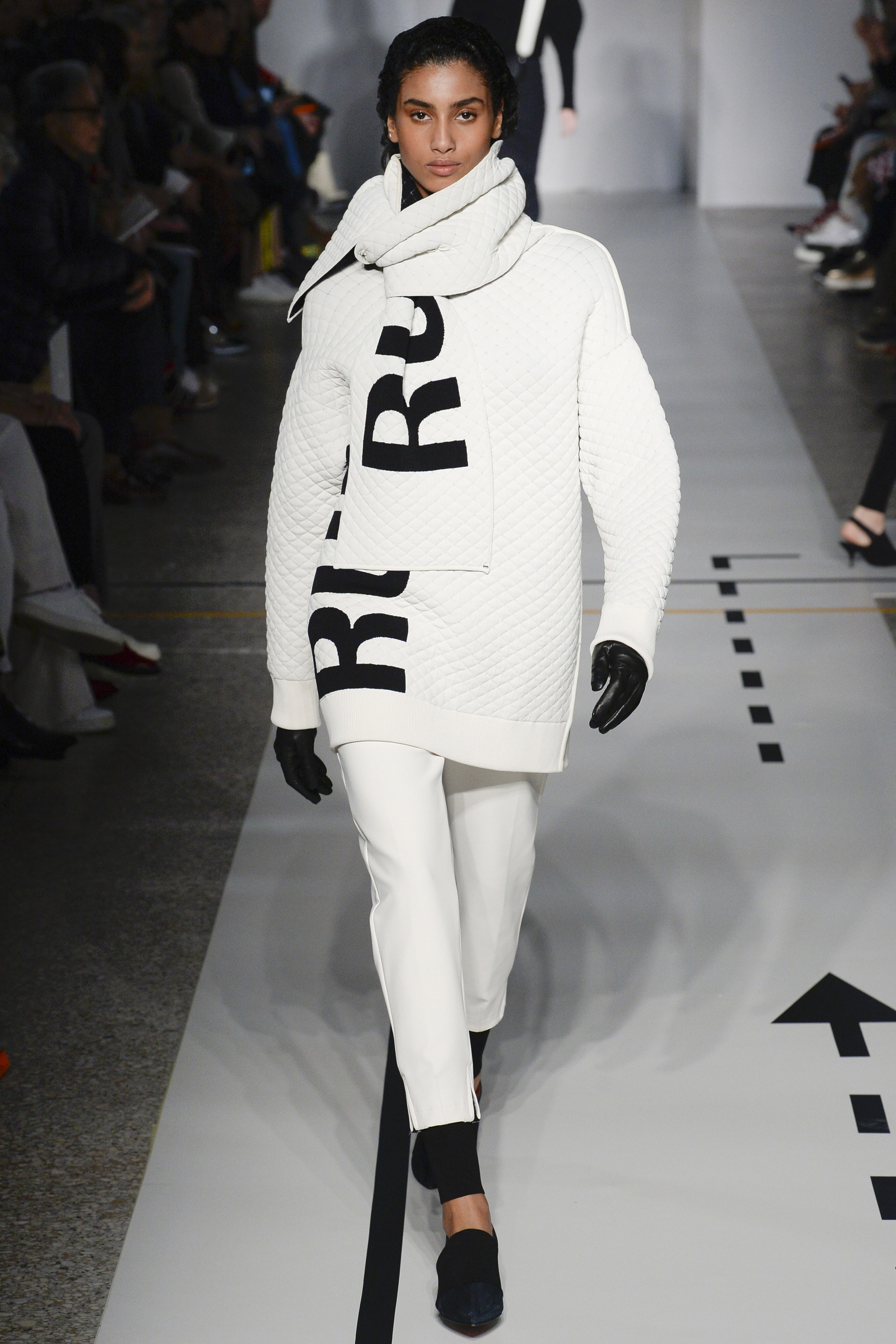 But it’s a logomania world, thus the collection’s graphics did pack a punch. A “Steady Run” skirt suit on Adwoa Aboah had major street style snap appeal, while a quilted “Run” scarf and sweater on Imaan Hammam was perfection…though not made for the actual sport, of course.