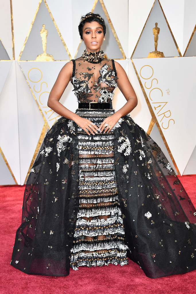 Janelle Monae sported a pixie cut to complement her breathtaking Elie Saab Couture embellished design with a sheer, bird-embroidered bodice. Certainly not for the faint of heart, but Janelle is really a pro at this.