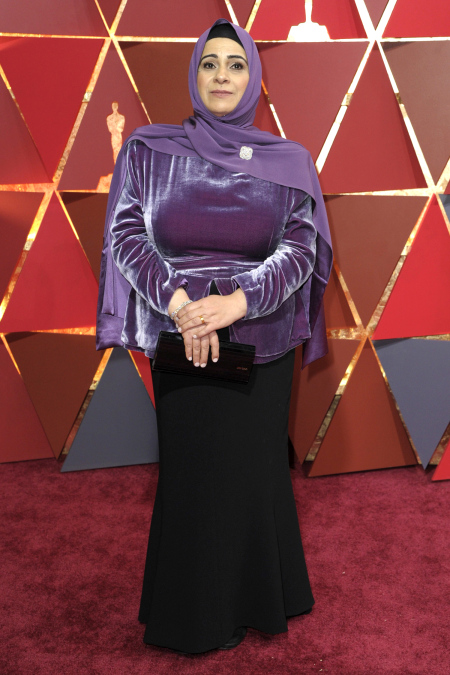Syrian refugee and subject of the Oscar-nominated Watani: My Homeland documentary Hala Kamil was outfitted in a purple hijab, purple velvet peplum jacket, and black maxi skirt by Brandon Maxwell.