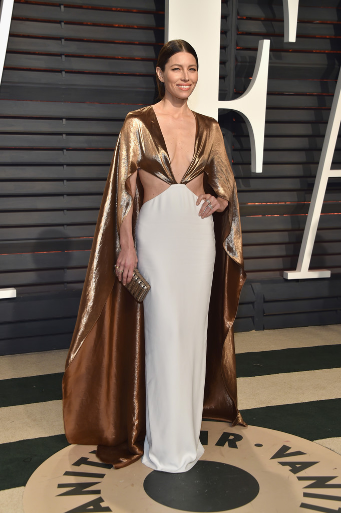 Jessica Biel was dipped in gold for the second time last night, this time going for a bronze metallic and white Ralph Lauren cutout cape gown. Haven’t seen a dress this brilliant in ages!