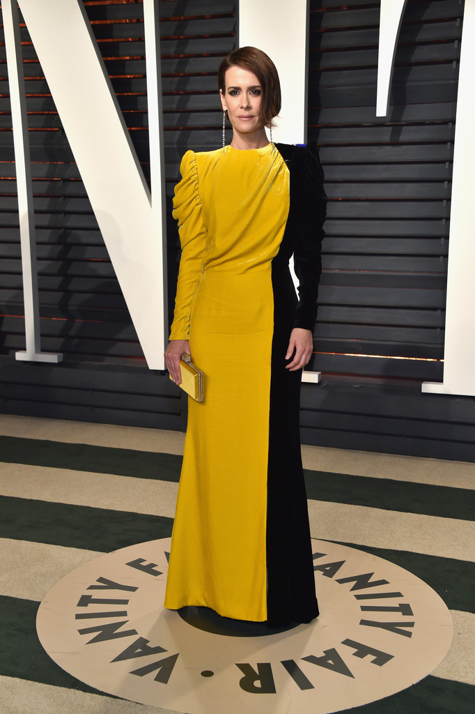 Sarah Paulson went bold in a two-tone, black and yellow Ronald van der Kemp velvet gown. Certainly not for the faint of heart, but Sarah wore it effortlessly.