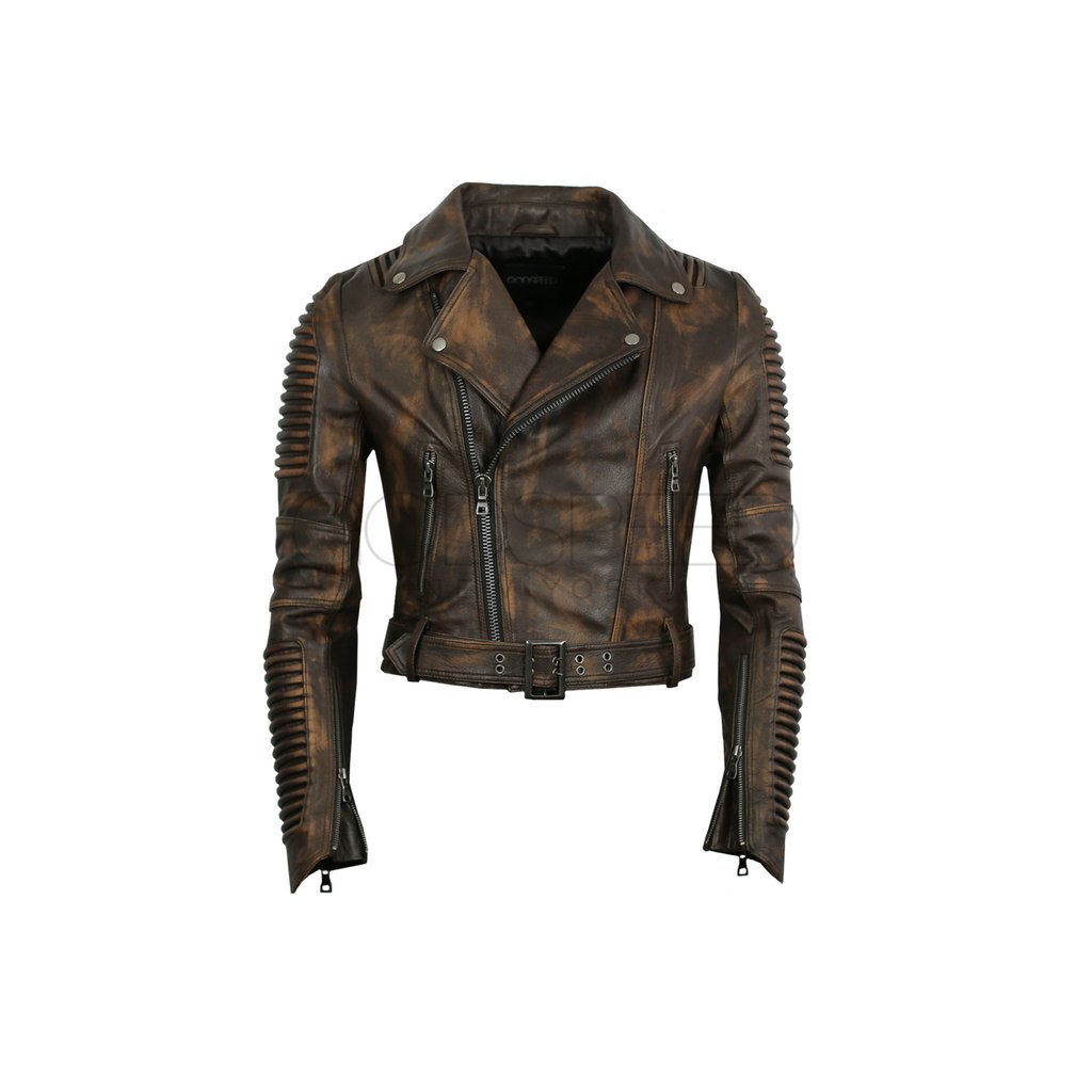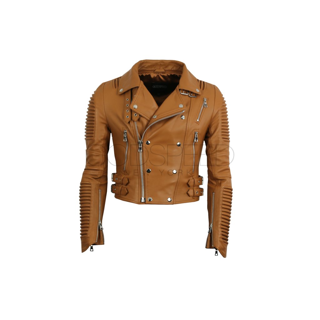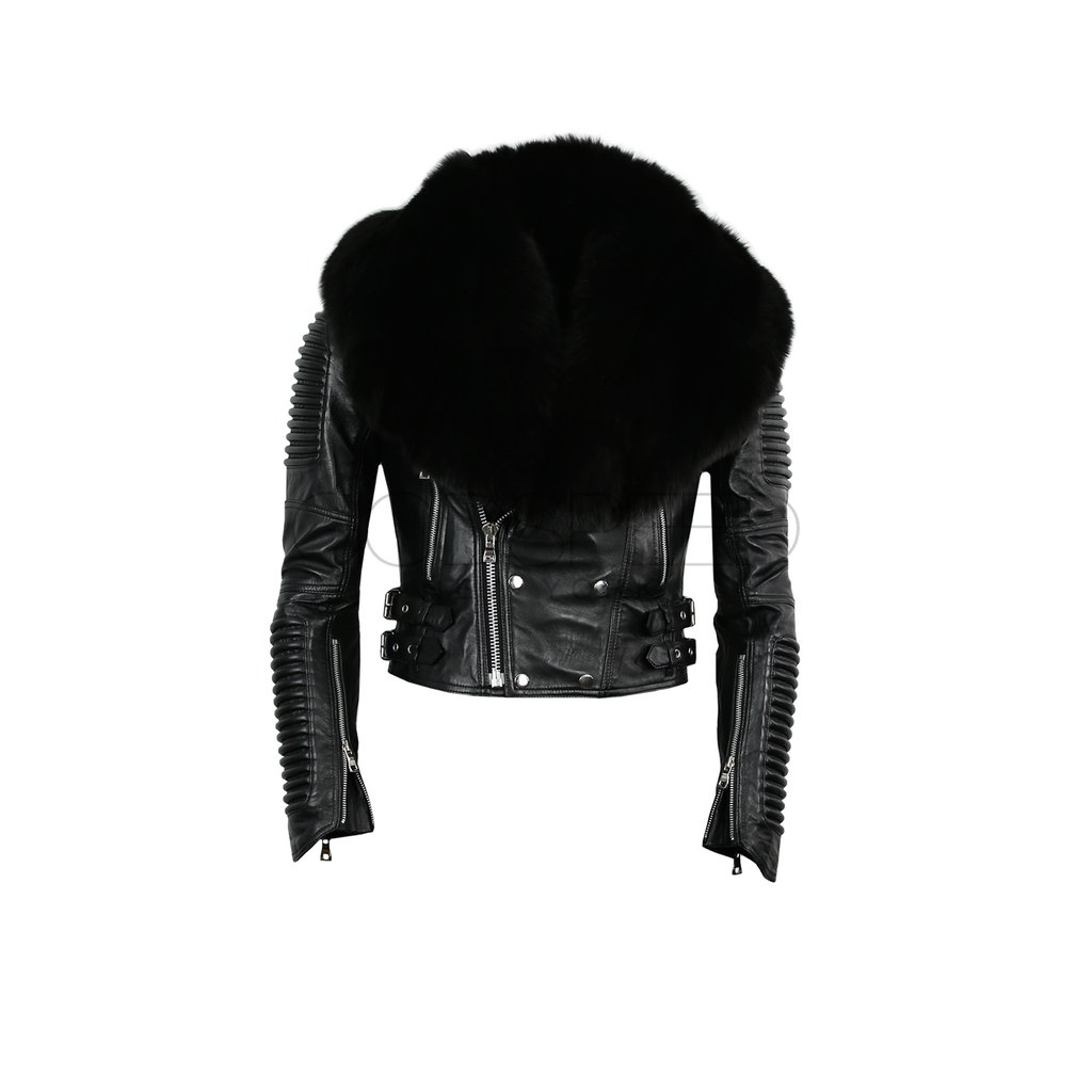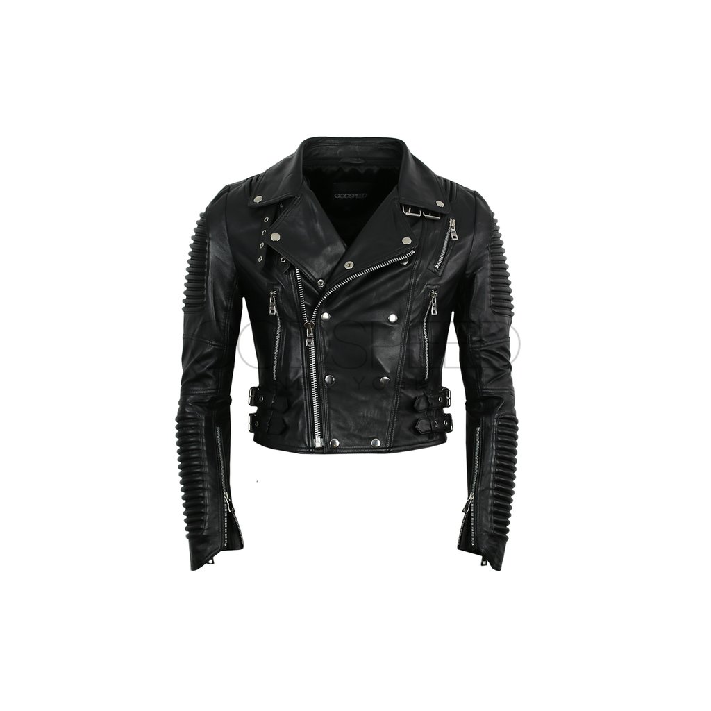 Constructed of lamb skin, The $540 piece has an asymmetrical zip and loads of hardware. Each jacket features ribbed detailing on the shoulder and elbow areas, accented with silver zippers and buckles.
