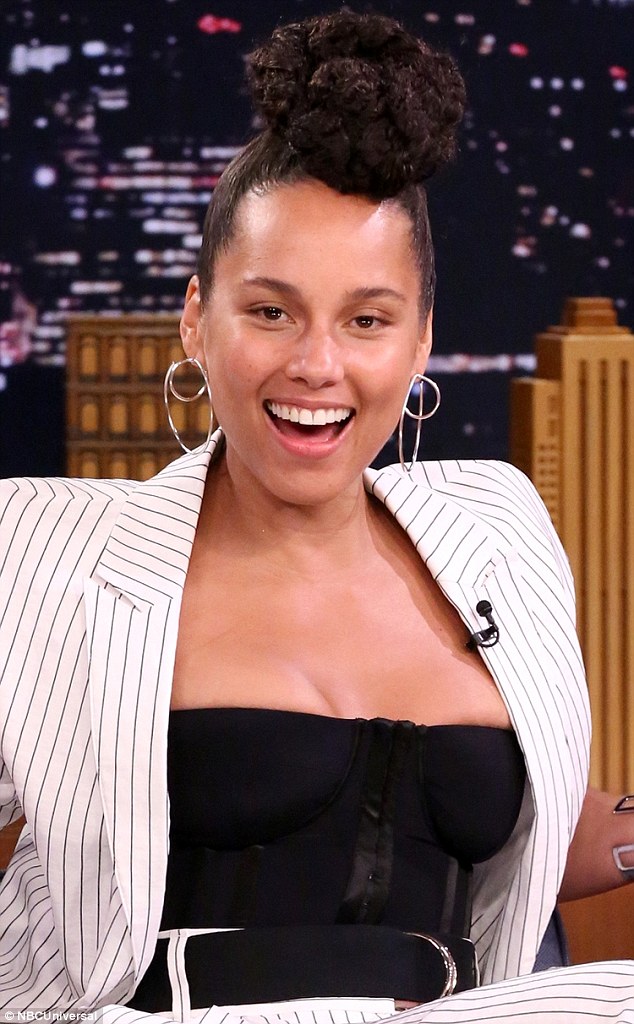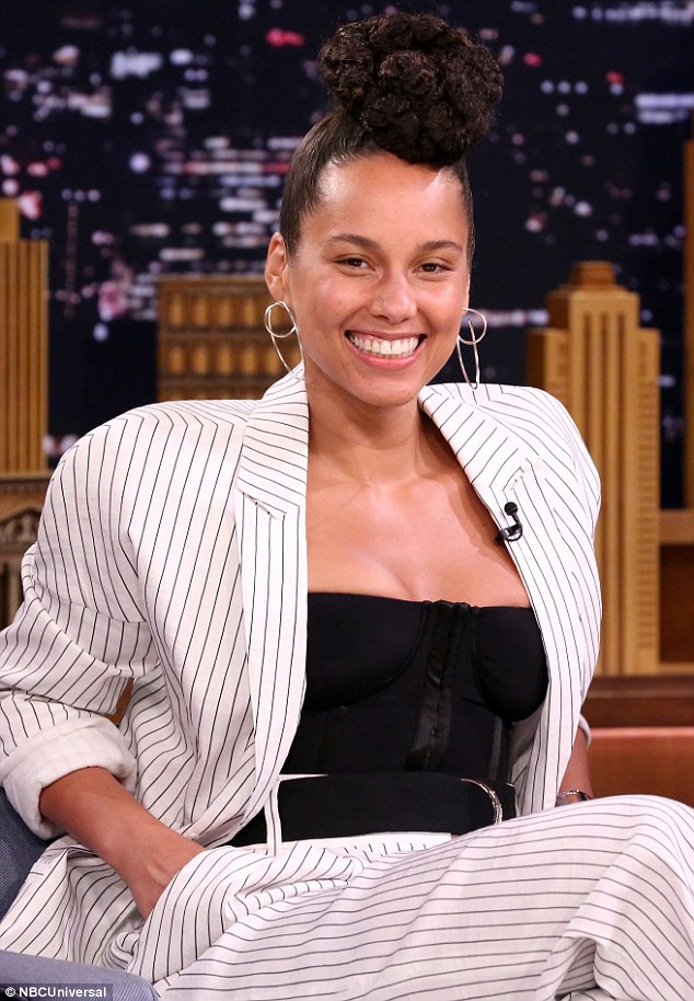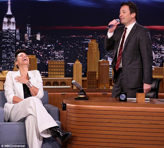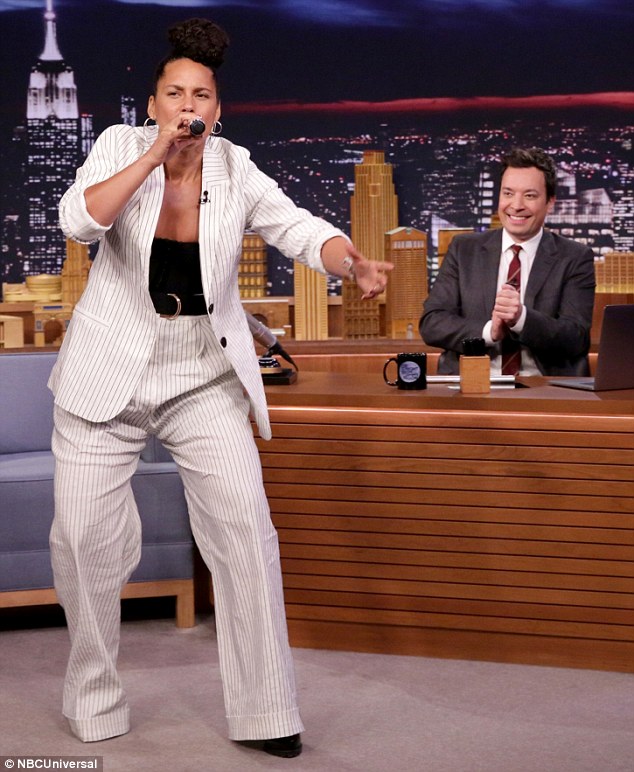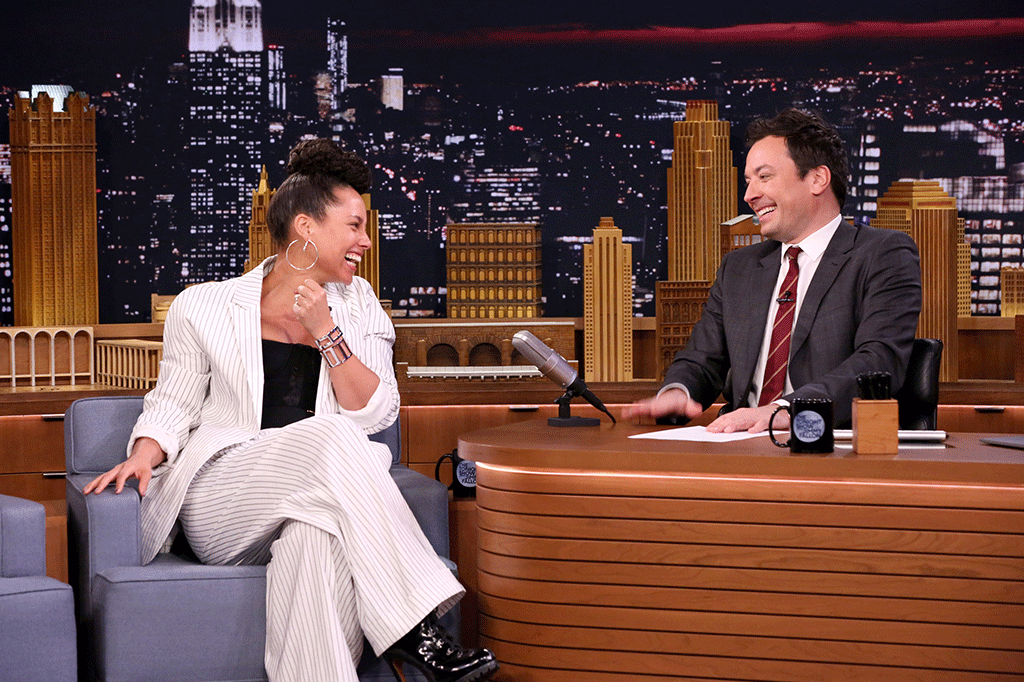 Alicia Keys sat down with Jimmy Fallon on The Tonight Show clad in Tibi’s Spring 2017 Cecil Striped Blazer ($595), Cecil Striped Trousers ($495) and $192 Lady Grey Torsion Hoop Earrings: