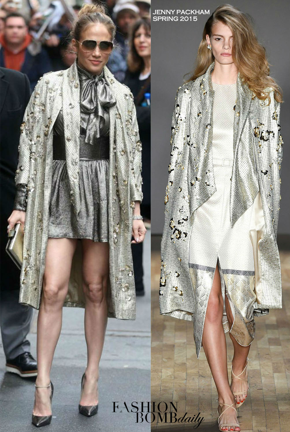 The style icon layered a Jenny Packham Spring 2015 embroidered coat over a $1,466 Saint Laurent Lightweight Twill Lamé Dress.