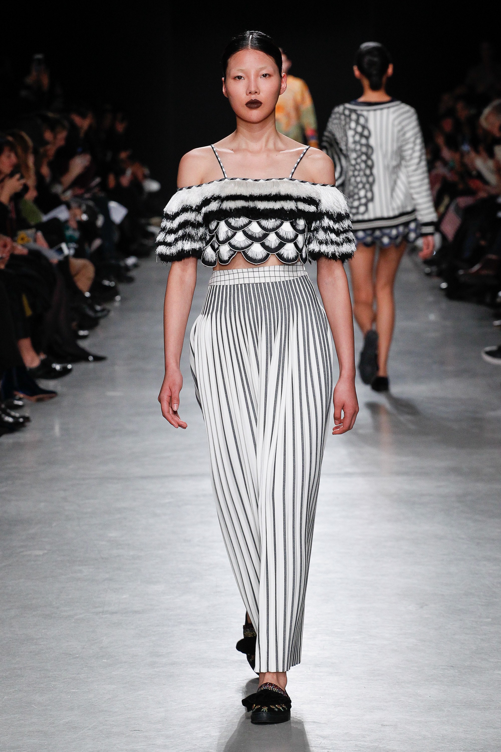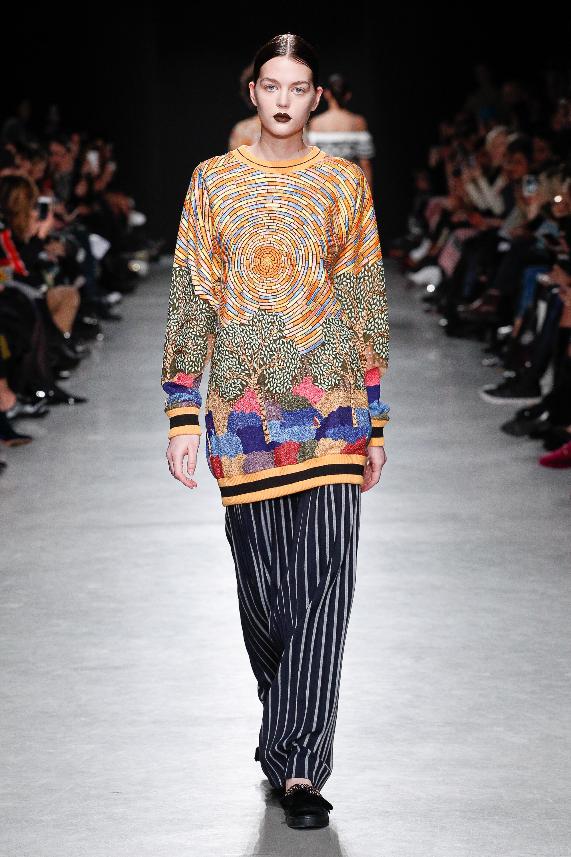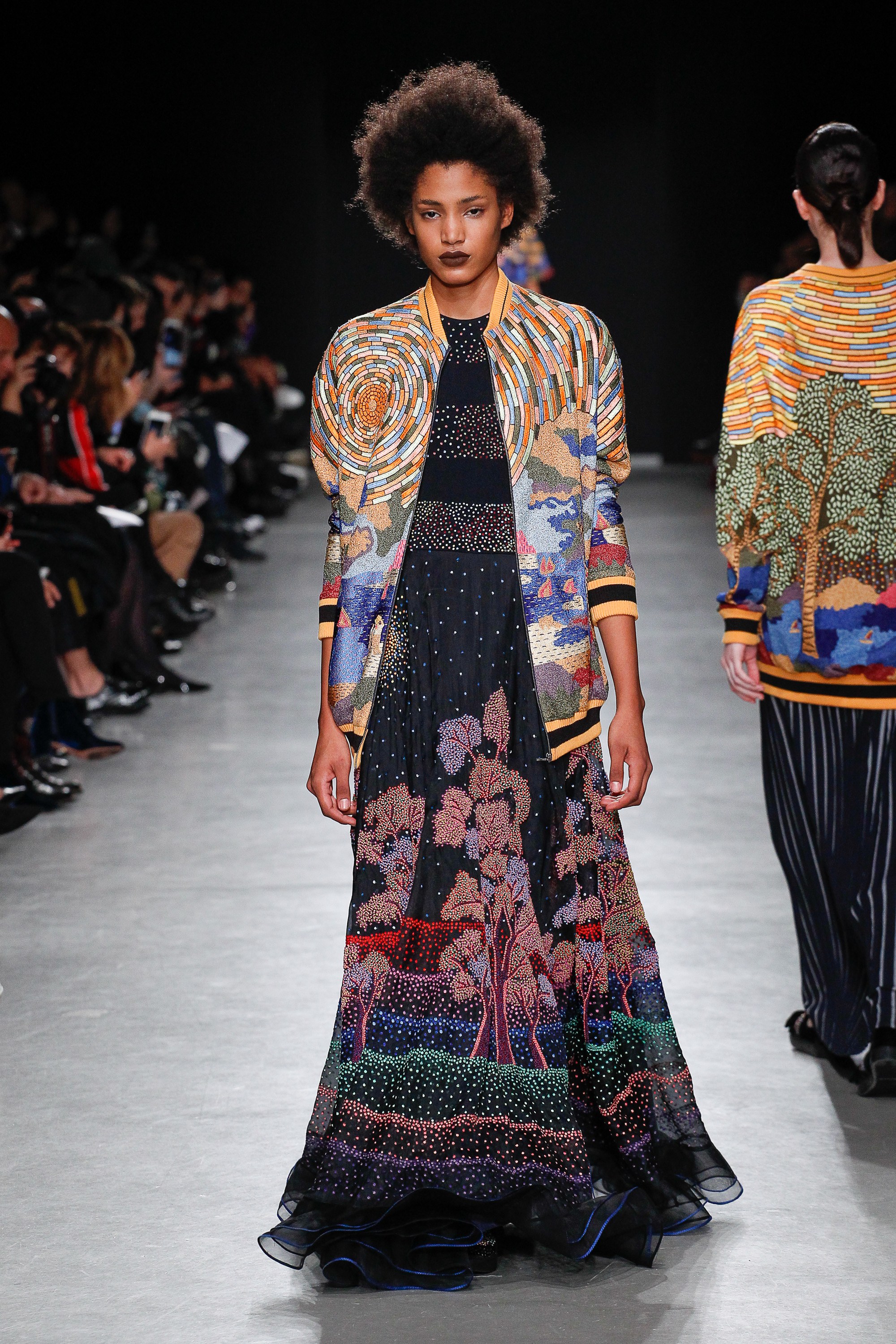 Art was the inspiration behind Rahul Mishra’s Fall 2017 collection—namely the work of French Neo-Impressionist painter Paul Signac who helped to develop pointillism. That influence rendered itself in landscape-embroidered knits, bombers, and ball gowns, and feather embellishment layered over stripes.