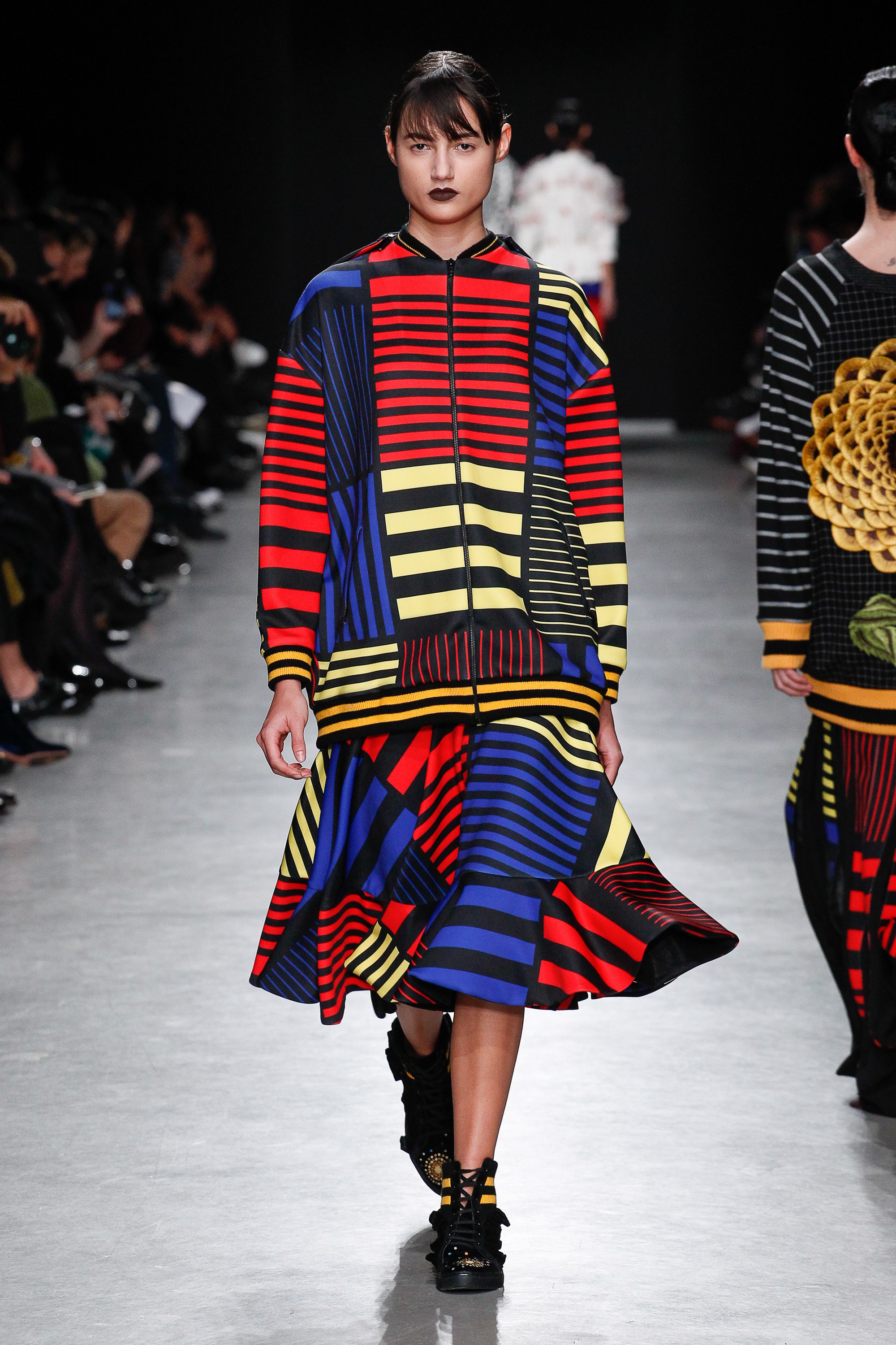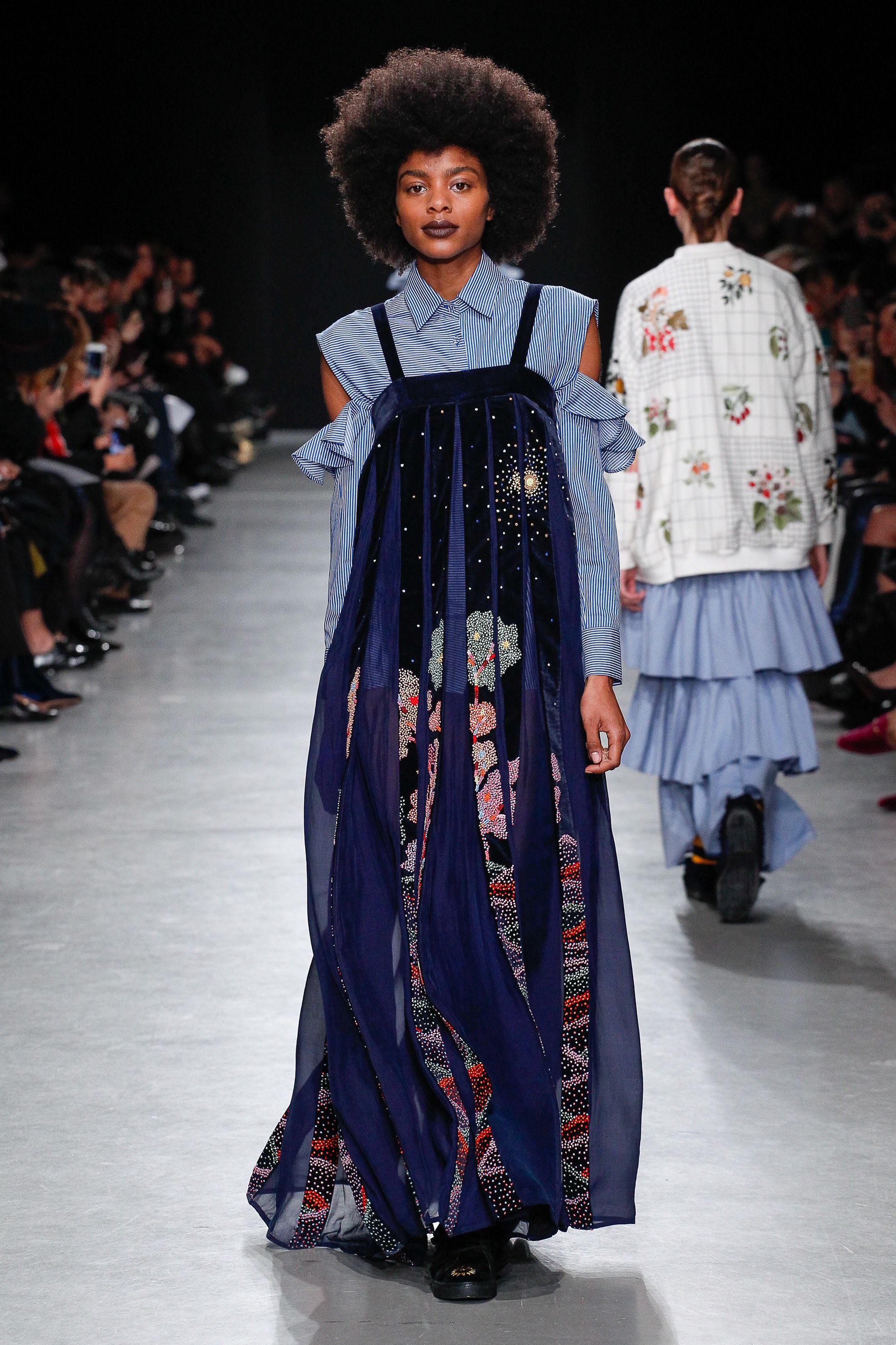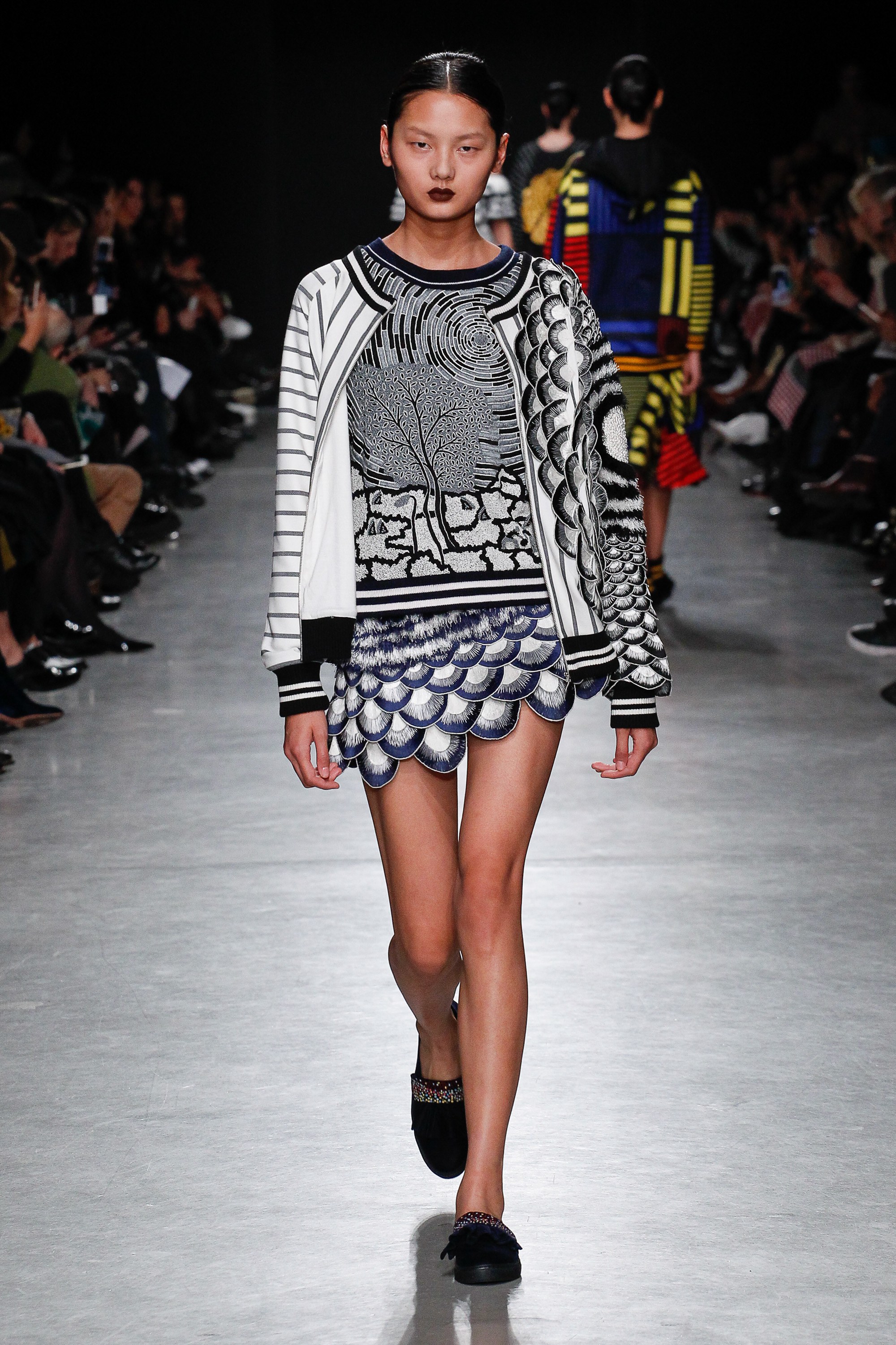 Art was the inspiration behind Rahul Mishra’s Fall 2017 collection—namely the work of French Neo-Impressionist painter Paul Signac who helped to develop pointillism. That influence rendered itself in landscape-embroidered knits, bombers, and ball gowns, and feather embellishment layered over stripes.