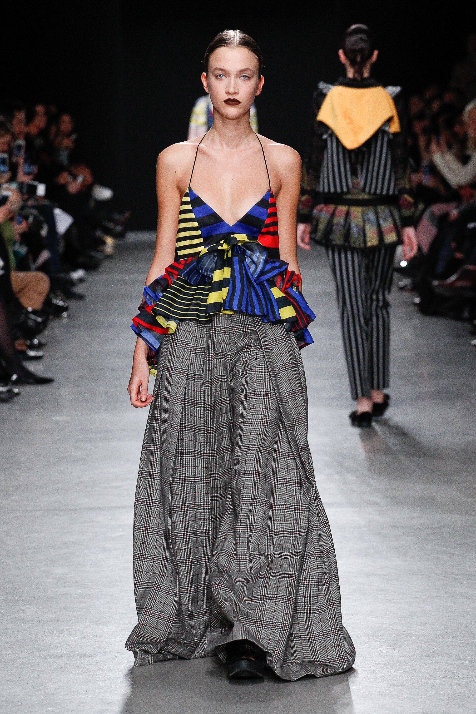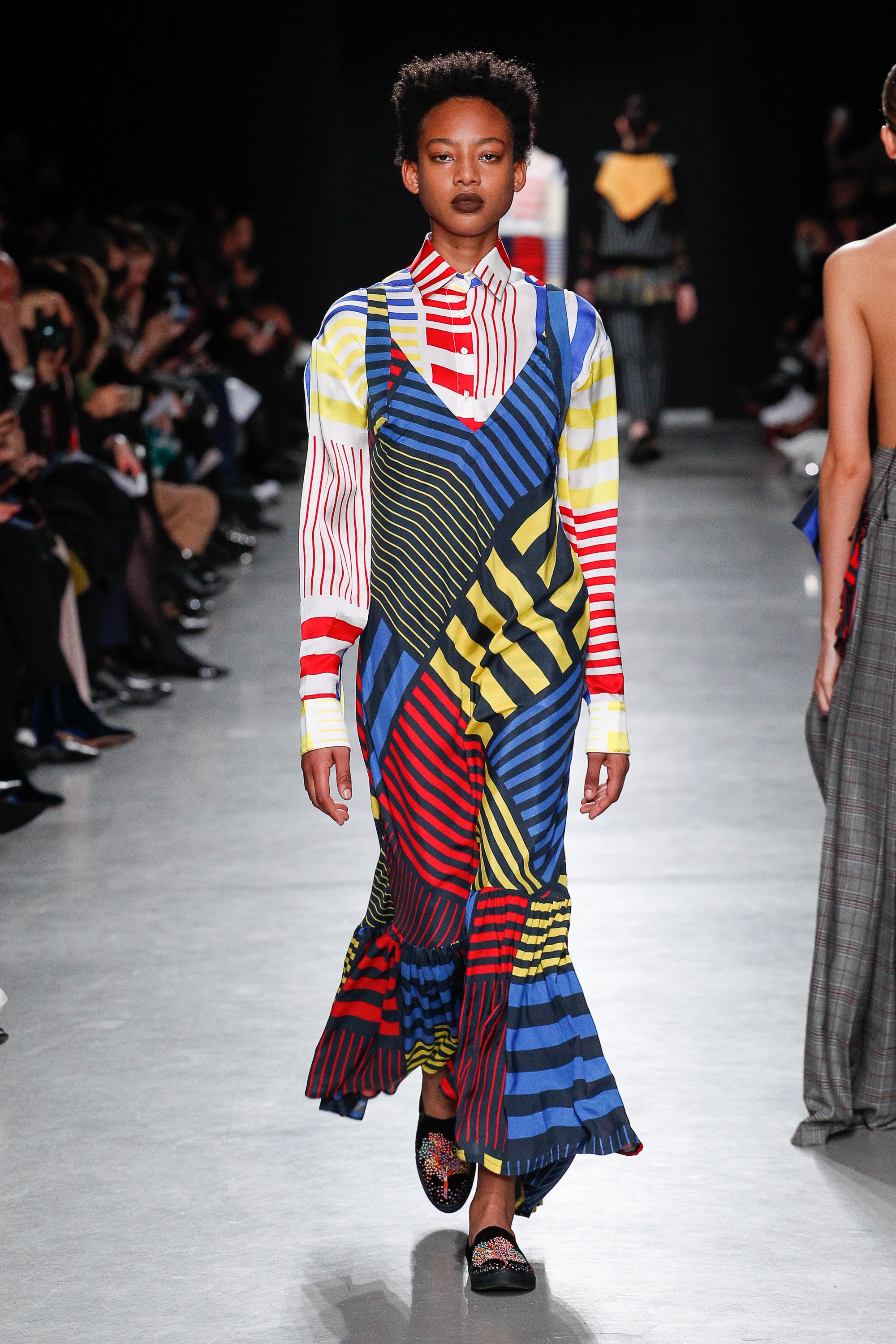 The way Mishra played with stripes was really fresh and playful, whether it was layering them under statement-making dresses, juxtaposing them with gingham and colorful pointillism-inspired landscape prints, or utilizing them on a sexy peplum top.