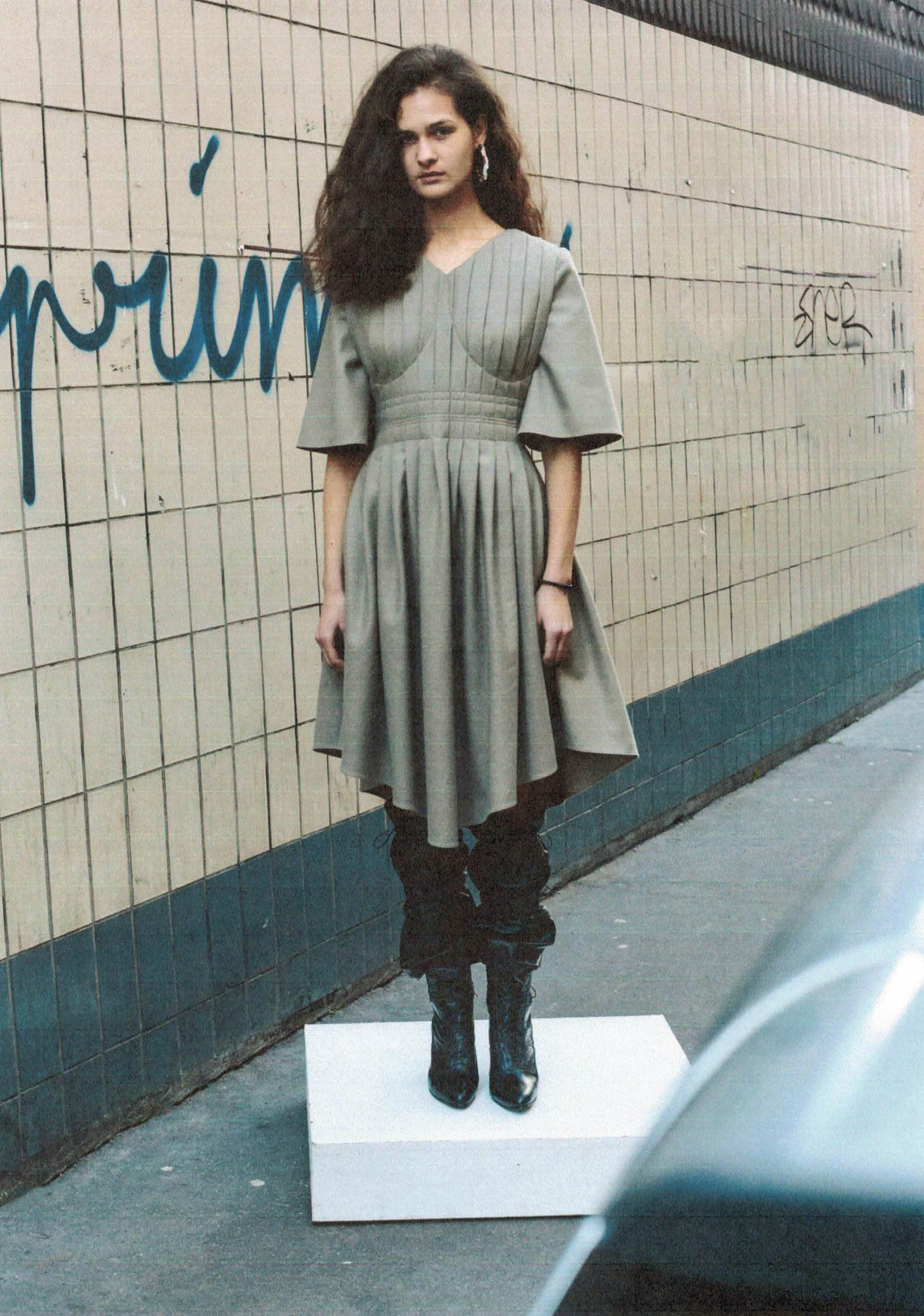 The way the brand injected traditionally feminine elements into its otherwise modern designs was intriguing. Ruched empire waists, square necklines, asymmetric hems for a flash of leg, molded busts, and tiered sleeves—they all made sense in the contemporary lineup.
