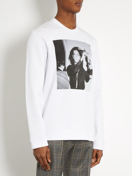 Her white sweater is made from loop-back cotton-jersey, features a print of Smith shot in 1978, and has a relaxed fit with a ribbed round neck that makes it ideal for layering.