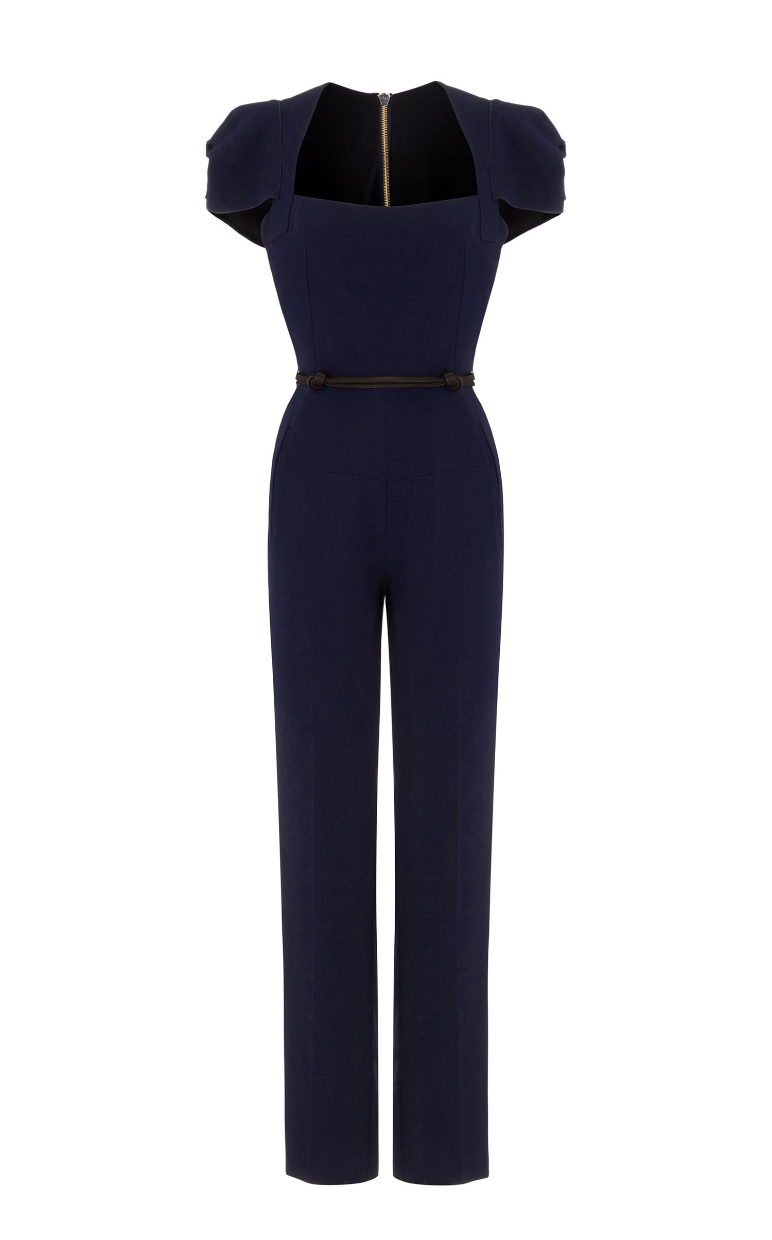 Her navy jumpsuit is a part of the brand’s Galaxy Ten Capsule Collection. The limited-edition piece features a fitted bodice and nipped-in waist.