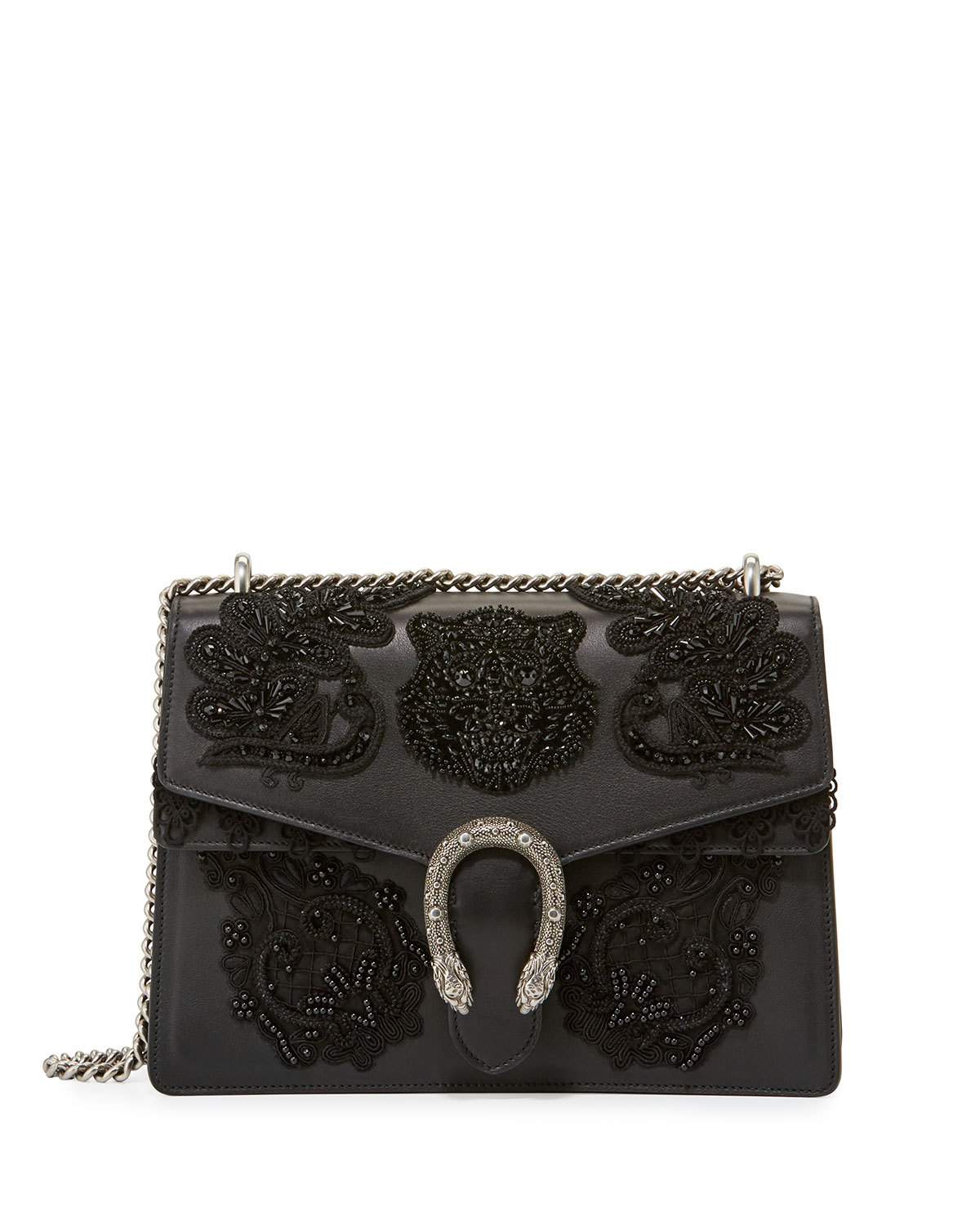 Her shoulder bag has tonal hand-embroidered appliqués depicting a tiger, peacock and leaves.