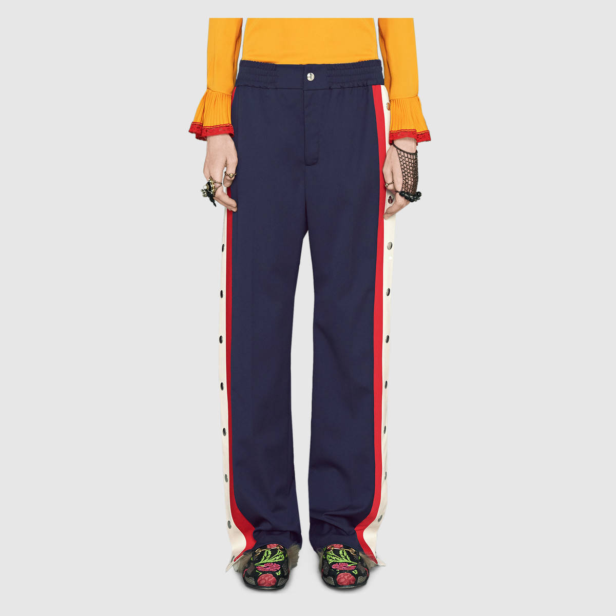 Kourtney’s blue Gucci wide-leg stretch wool silk jogging pant features red and white stripes on the sides with snap button detailing down the pant legs.