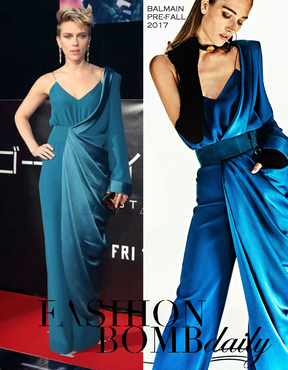 Scarlett Johansson couldn’t be missed at the Ghost In The Shell Tokyo Premiere in a Balmain Pre-Fall 2017 Teal Asymmetric Sleeve Draped Jumpsuit: