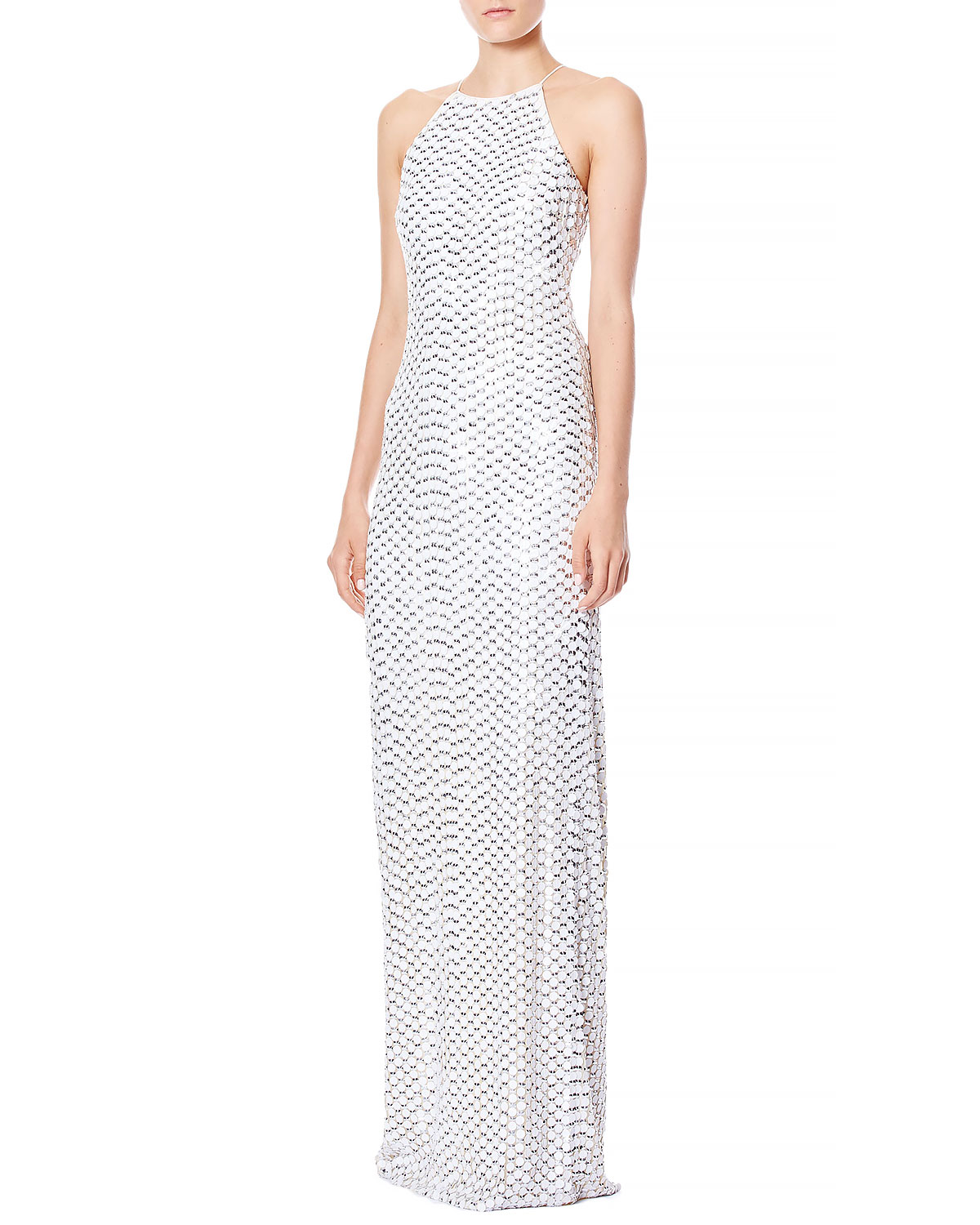 Her beaded dress features a column-inspired silhouette. Ashley shortened hers to midi length.