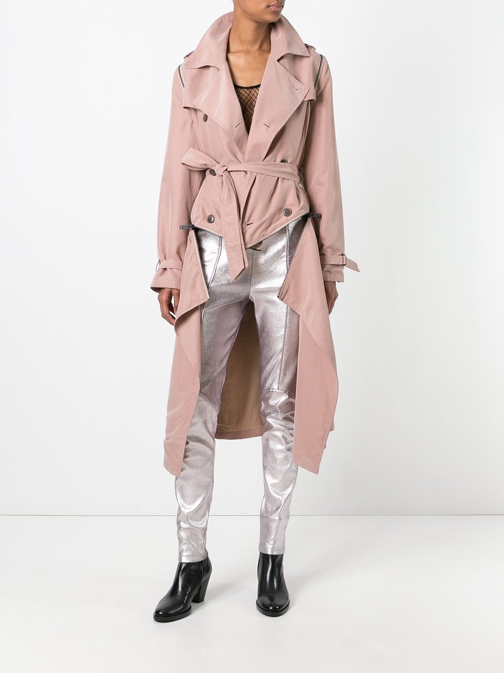 The skin nude ‘Moment’ trenchcoat from A.F. Vandevorst features black trim and a tie waist.