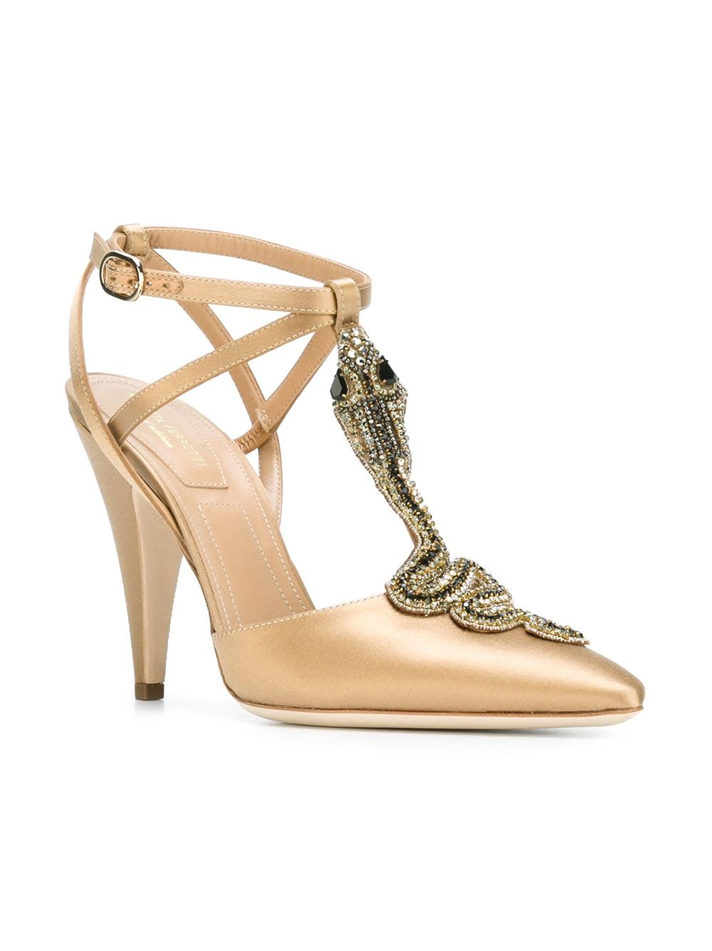 The nude leather embellished snake pumps from Alberta Ferretti have a pointed toe and feature a side strap.