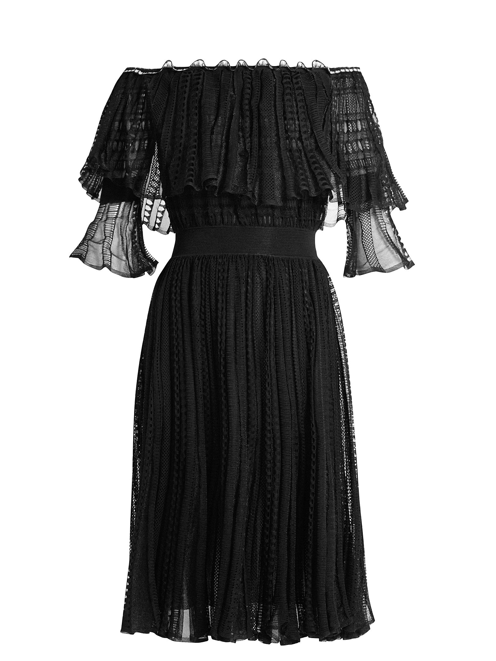 Her lightweight LBD is crafted from a sheer striped ladder-lace knit. It features a round neck, off-the-shoulder silhouette, elbow-length layered sleeves, elasticated large frilled cuffs, a beige and black ruffle-trim elasticated neckline, and a ribbed knit waistband.